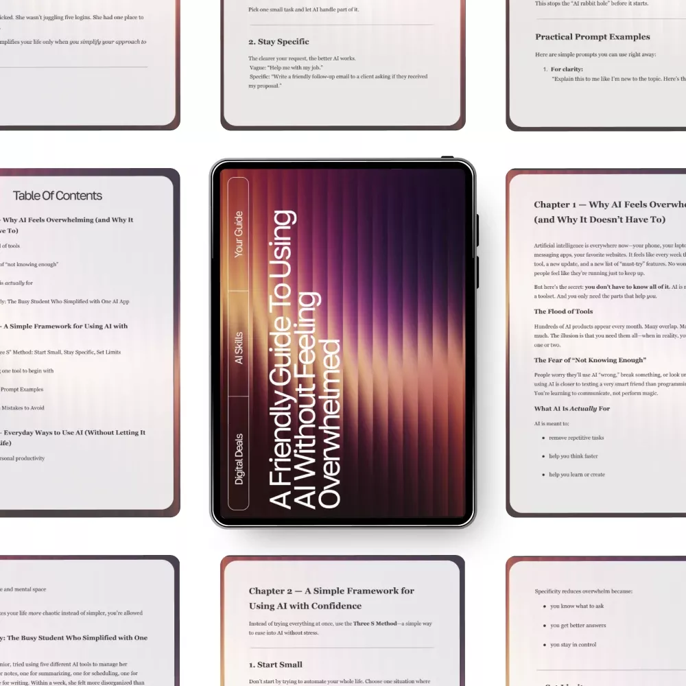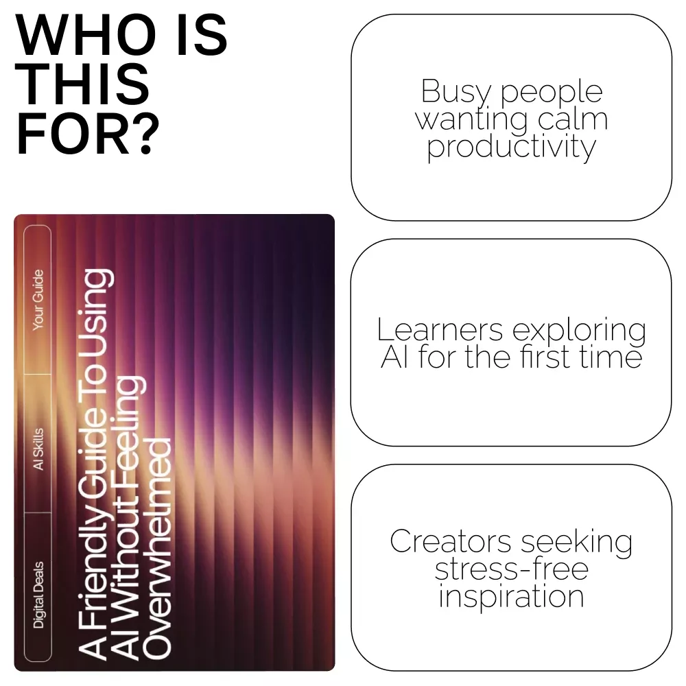 This guide is made for anyone curious about AI but unsure where to start. Perfect for busy learners, creators, small business owners, or anyone feeling overloaded by technology. A Friendly Guide to Using AI Without Feeling Overwhelmed helps you find calm, clarity, and control while discovering how to use ai without getting overwhelmed—so AI works for you, not the other way around.