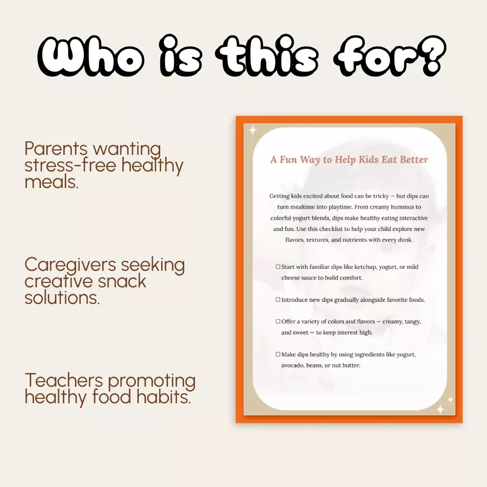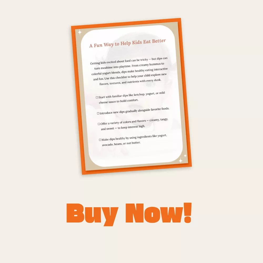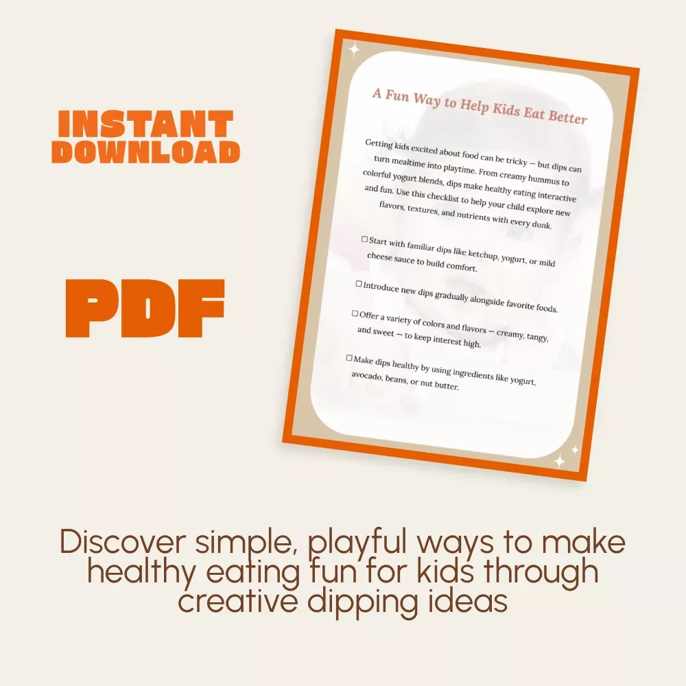 Getting kids excited about healthy food can be challenging, but it doesn’t have to be. A Fun Way to Help Kids Eat Better is a beautifully designed printable checklist that turns mealtime into playtime through one simple trick — dips! This easy-to-use guide helps parents discover how to use dips to help kids eat more fruits, veggies, and whole foods. With colorful ideas, creative tips, and practical guidance, you’ll inspire your little ones to explore new flavors and textures — all while making mealtime enjoyable and stress-free.