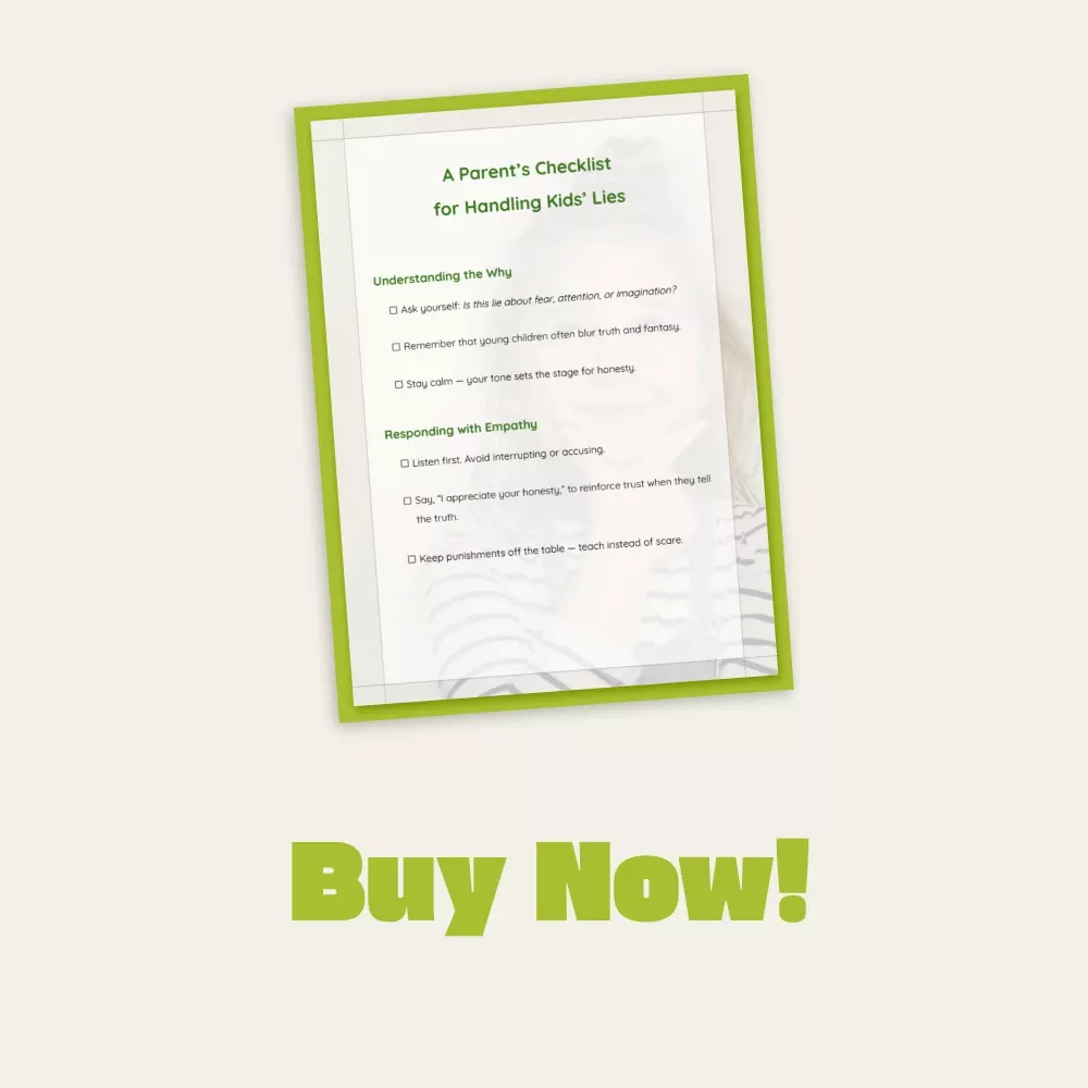 Turn difficult moments into growth opportunities with A Parent’s Checklist for Handling Kids’ Lies. Learn how to handle children’s lying with calm understanding, model truth-telling, and strengthen your bond every day. Download your digital checklist now and start transforming how your family talks about honesty—one conversation at a time.