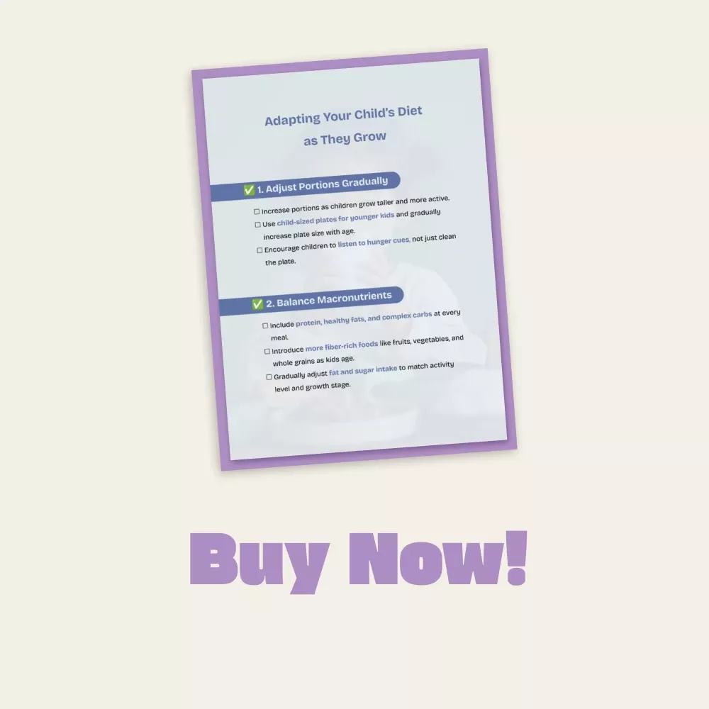 Download Adapting Your Child’s Diet as They Grow today and take the guesswork out of mealtime! Empower your family with healthy, age-appropriate eating habits and enjoy the confidence of knowing you’re supporting your child’s growth — one delicious meal at a time.