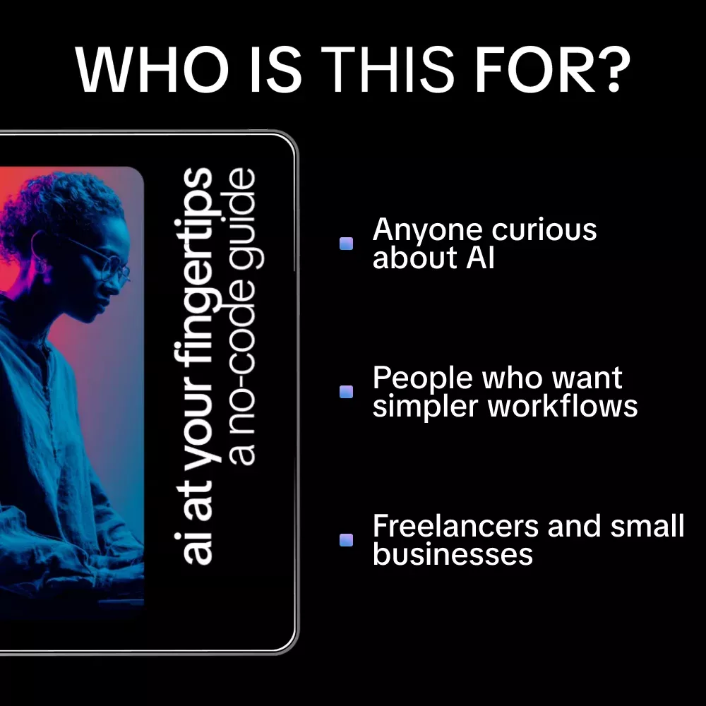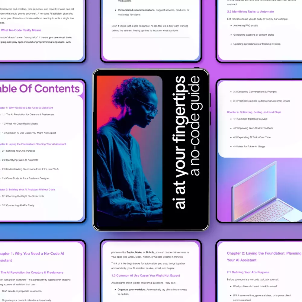 AI at Your Fingertips: A No-Code Guide doesn’t just explain AI concepts—it walks you step-by-step through how to build a no code AI assistant with real, actionable examples. Whether you’re automating emails, organizing tasks, or planning AI for your freelance projects, this guide makes AI accessible, practical, and immediately usable.