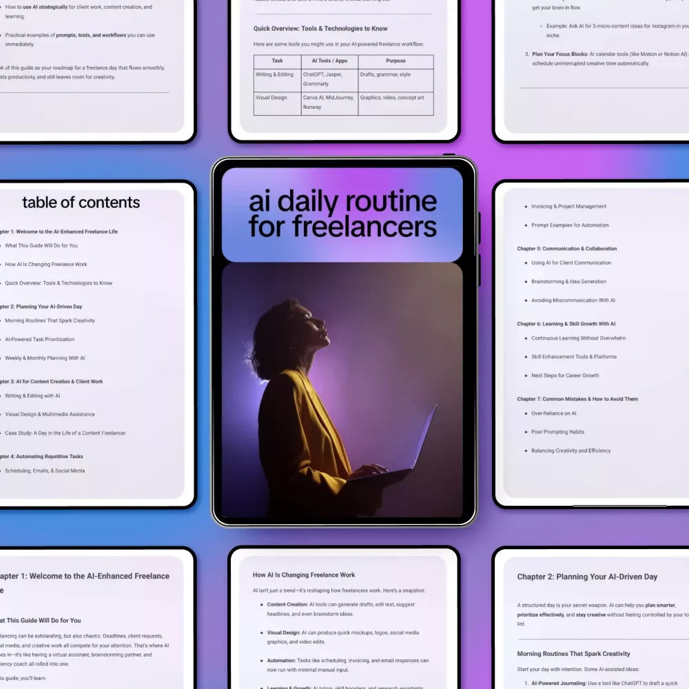 Freelancing doesn’t have to mean juggling endless tasks, scattered ideas, and long workdays. AI Daily Routine For Freelancers is a practical, easy-to-follow ebook designed to help you build a focused, efficient daily workflow using artificial intelligence. This guide shows you how to plan your day, manage client work, and grow your skills without burnout. Whether you are new to AI or already experimenting with tools, this ebook helps you turn technology into a daily advantage instead of a distraction.