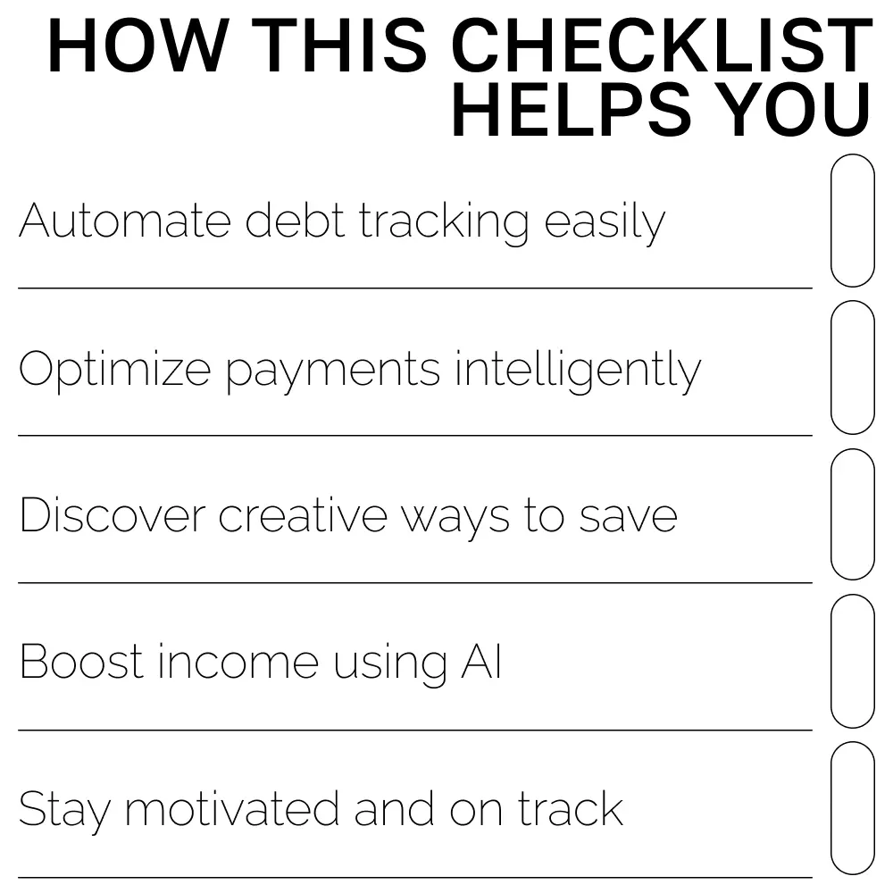 Unlike traditional budgeting guides, this resource focuses entirely on how to use ai to get out of debt. You’ll learn to leverage AI tools that simplify decisions, automate tasks, and personalize your financial plan—all in one clear, actionable checklist.