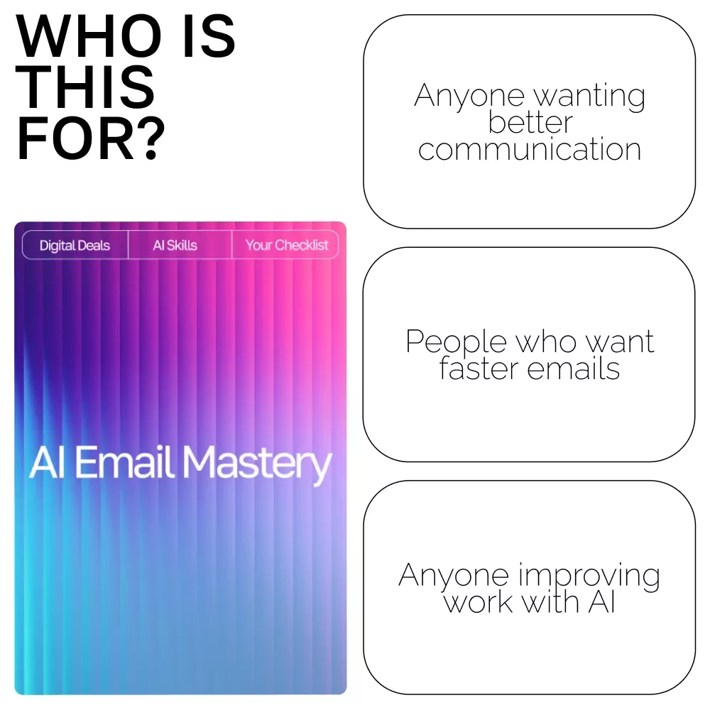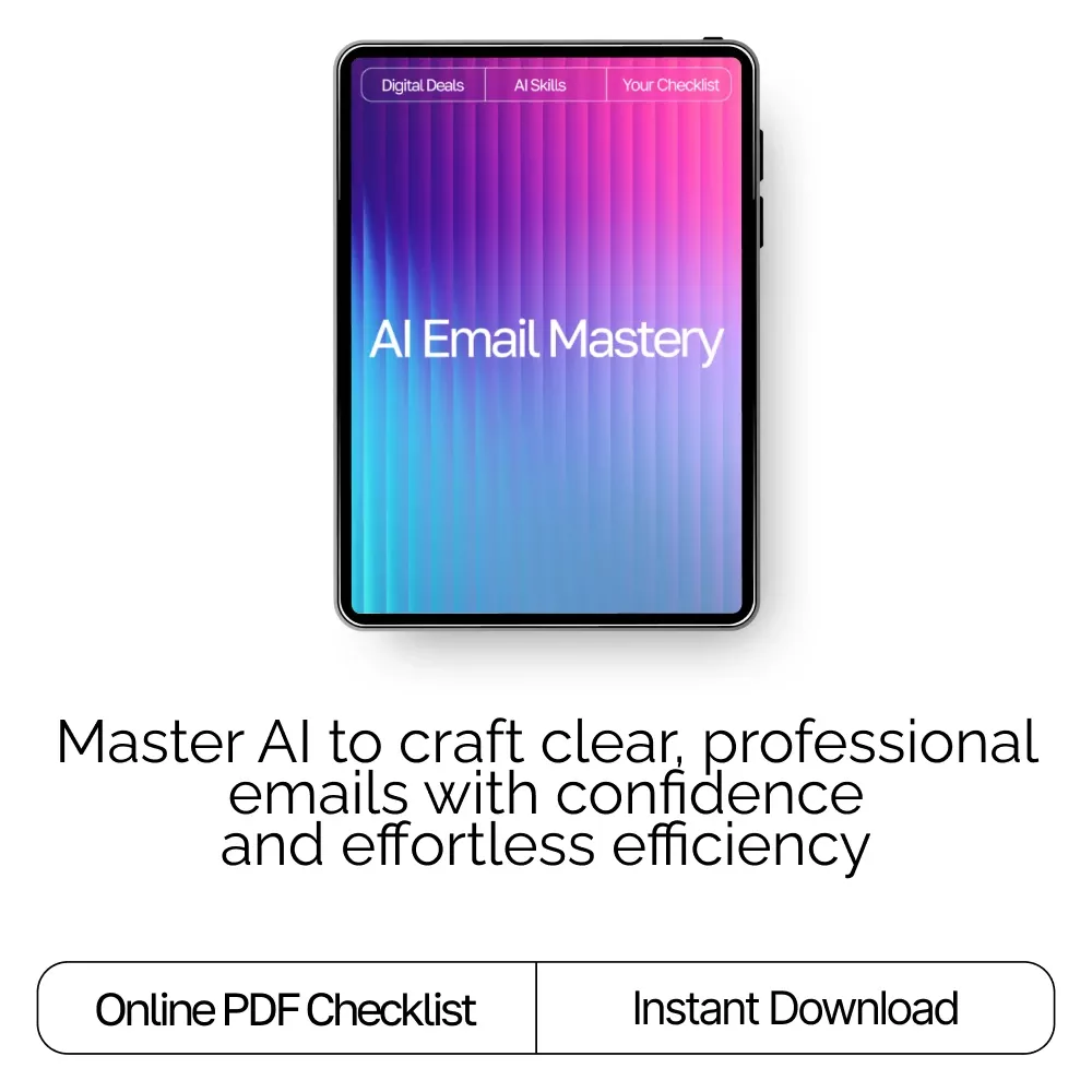 Unlike generic email-writing templates, AI Email Mastery is a guided checklist that teaches you how to think, plan, and communicate more effectively using a smart blend of structure and AI tools. It empowers you with adaptable strategies rather than rigid scripts, giving you confidence in every message you write.