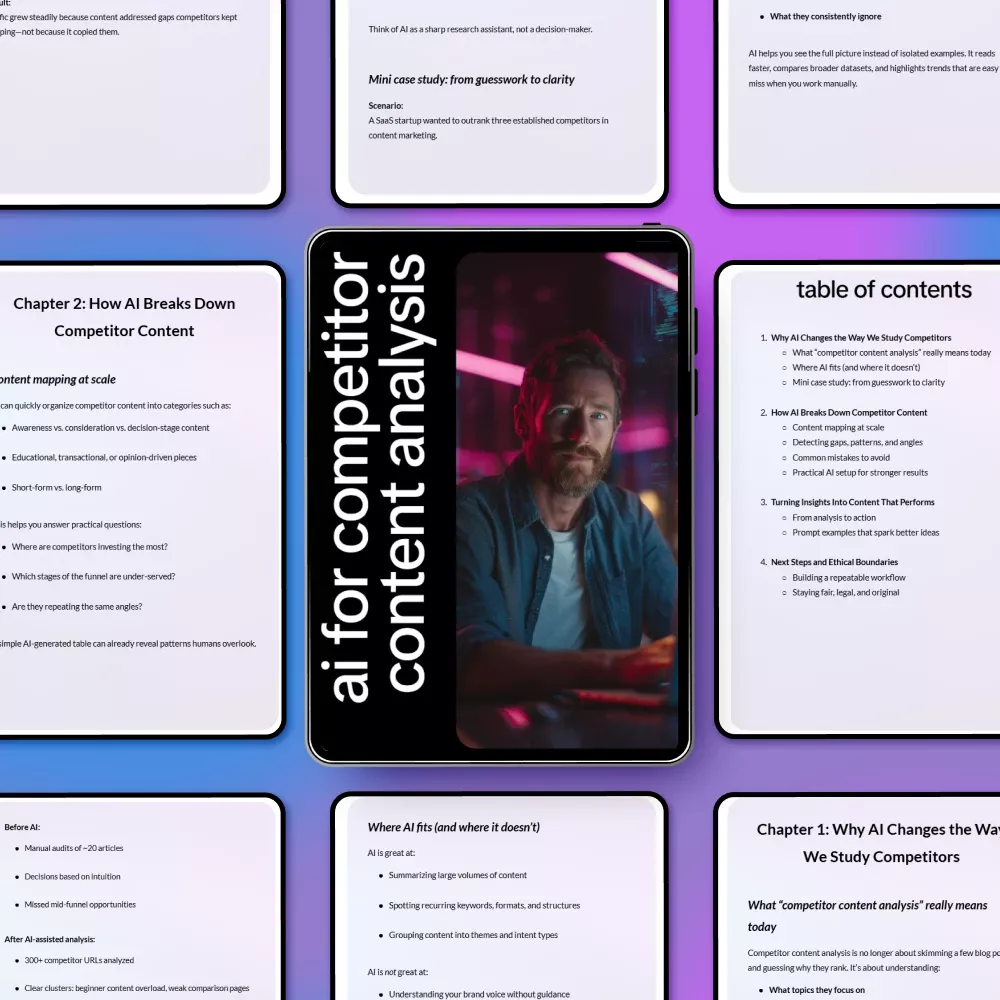 If you’ve ever looked at competitor content and felt overwhelmed, unsure what actually works, or tired of guessing your next move, this guide was created for you. AI for Competitor Content Analysis shows you how to use AI as a practical research partner—helping you see patterns, gaps, and opportunities that are nearly impossible to spot manually. This isn’t theory-heavy or hype-driven. It’s a clear, step-by-step digital resource designed to turn competitor research into confident, actionable content decisions.