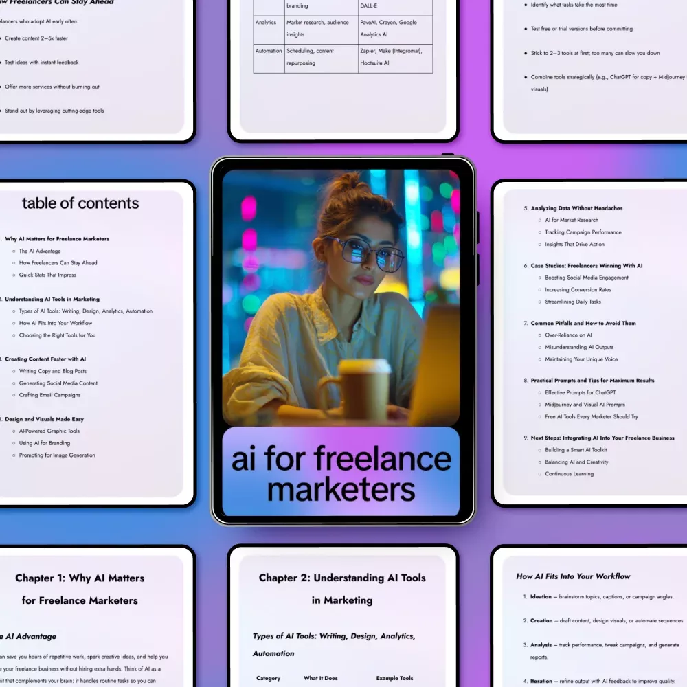Unlike other digital resources, this guide focuses specifically on AI for freelance marketers, blending practical tips with actionable strategies. It combines insights on content, design, and analytics in one place, making it an indispensable toolkit for freelancers who want results, not just theory.