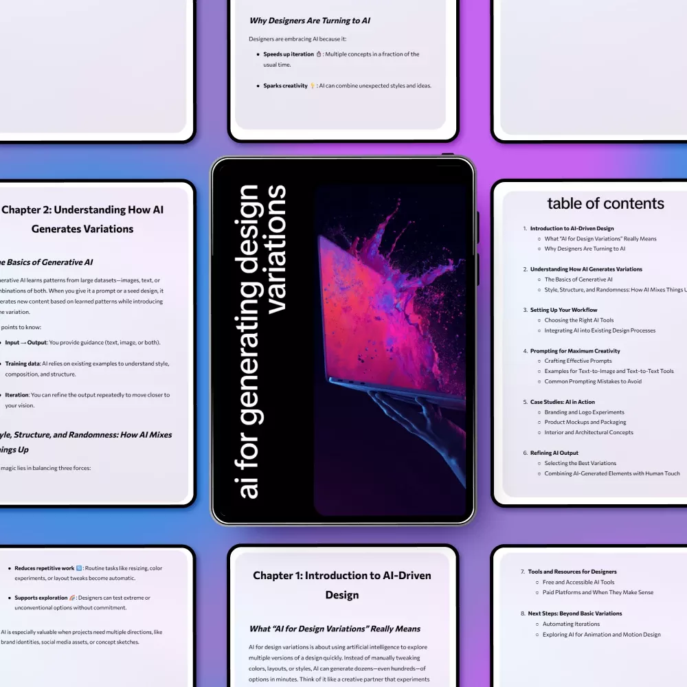 Design no longer has to start from a blank canvas. AI for Generating Design Variations is a practical, easy-to-follow digital guide that shows you how to use artificial intelligence to explore more creative directions in less time. Whether you are experimenting with branding, product visuals, or spatial concepts, this guide breaks down how AI can become a powerful extension of your creative process. Instead of replacing creativity, AI helps you multiply it—giving you fresh perspectives, unexpected combinations, and faster iteration cycles.