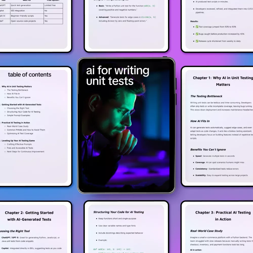 Struggling to keep up with unit testing while shipping features fast? AI for Writing Unit Tests is a practical, no-fluff digital guide designed to show you exactly how AI can transform the way you write, scale, and maintain unit tests. Whether you’re tired of repetitive test writing or unsure how to trust AI-generated output, this guide walks you step by step through using AI as a reliable testing assistant. You’ll learn how to reduce testing bottlenecks, improve coverage, and integrate AI into your existing development workflow with confidence.