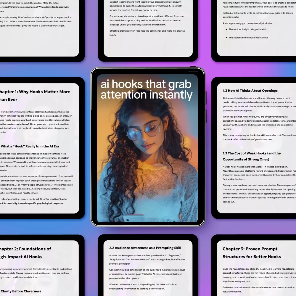 Unlike most AI writing resources, this ebook focuses specifically on hooks—the most critical part of your content. It doesn’t just tell you what makes a hook good; it shows you how to communicate that to AI with clear frameworks, examples, and reusable prompts. You’ll walk away with a system, not just inspiration.