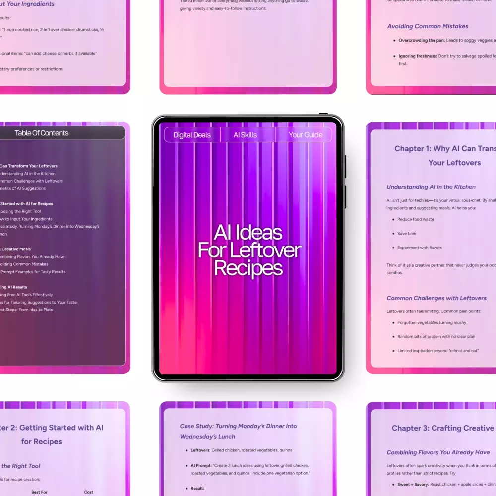 Discover how to turn forgotten fridge items into flavorful meals with AI Ideas for Leftover Recipes—your go-to digital guide for unlocking ai recipe suggestions using leftovers. This easy-to-follow resource shows you how to pair everyday ingredients with powerful AI tools, helping you reinvent yesterday’s meals into something fresh, fun, and delicious. Whether you struggle with food waste or just want quicker kitchen inspiration, this guide makes creative cooking effortless.