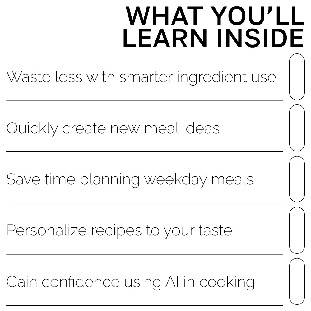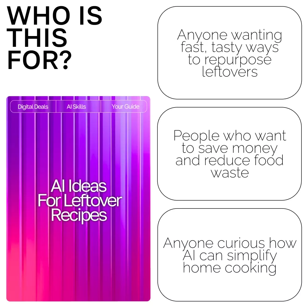 Unlike generic recipe ebooks, this resource teaches you how to think creatively using AI so you can generate new dishes anytime. It focuses specifically on ai recipe suggestions using leftovers and gives you real prompts, real examples, and repeatable strategies—making it a practical, everyday kitchen companion.