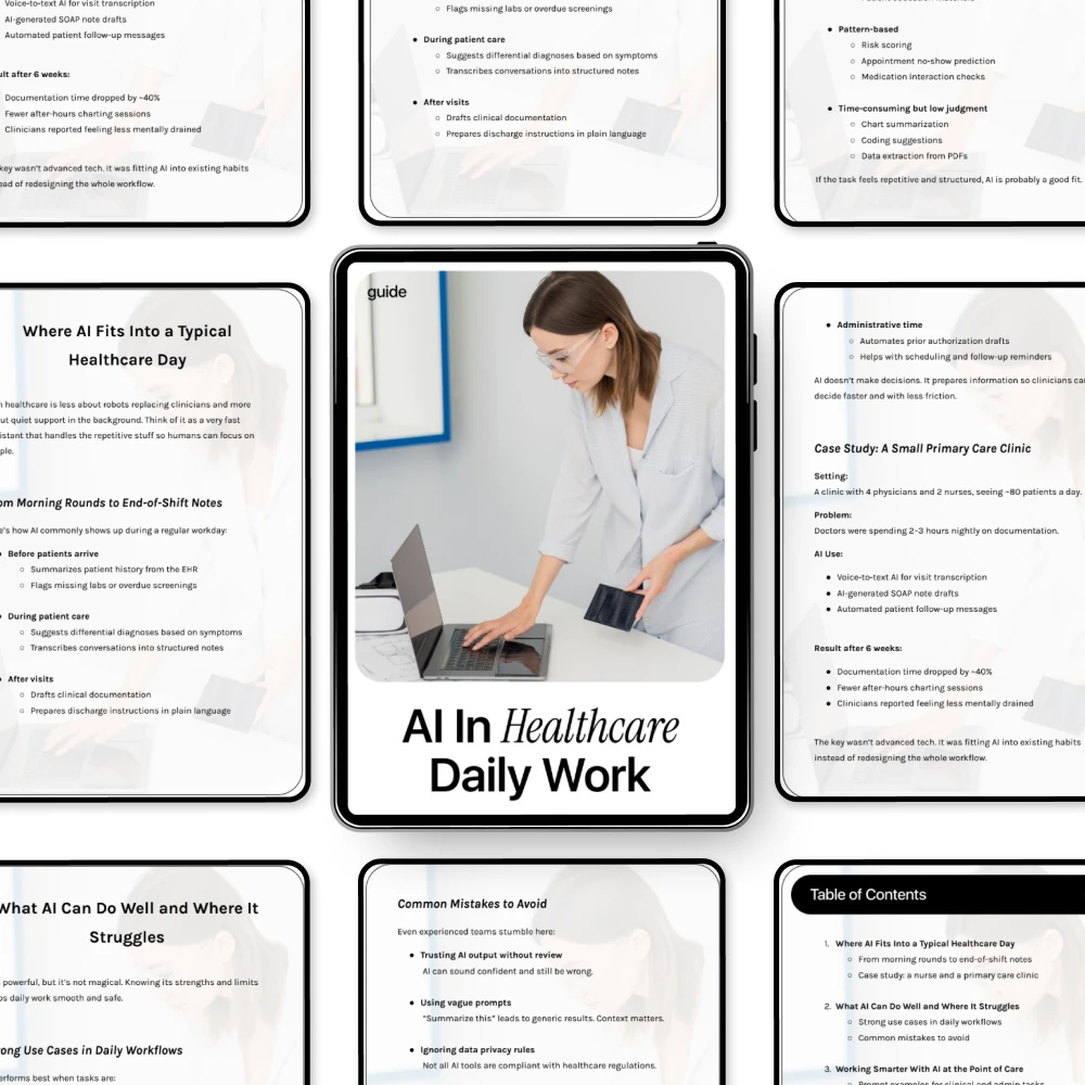 This guide is ideal for healthcare professionals wanting to save time, reduce admin load, and improve decision-making. Whether you’re a clinician, nurse, practice manager, medical assistant, or healthcare student, you’ll discover practical ways to use AI in healthcare daily work with confidence.