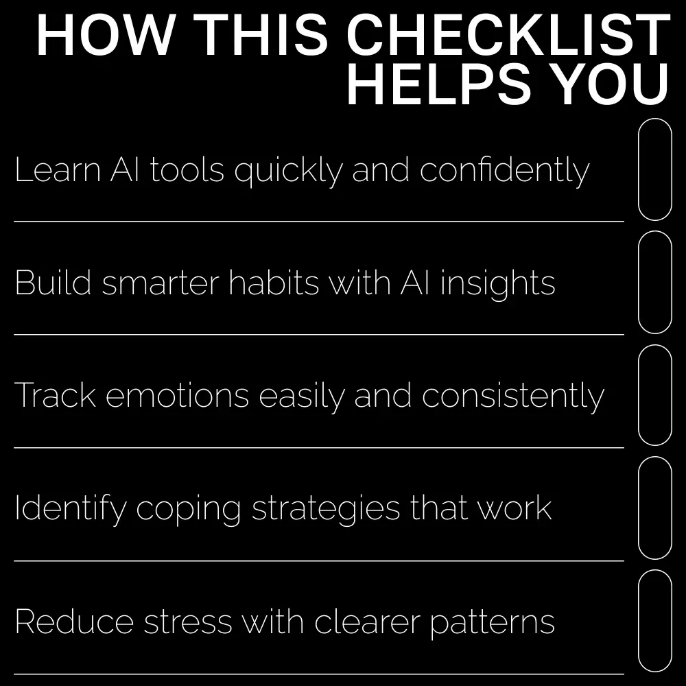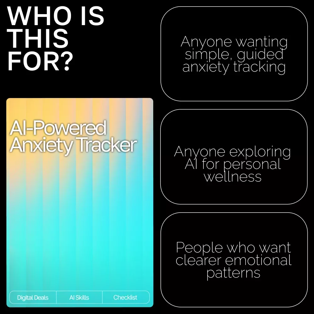 This digital guide is ideal for anyone experiencing anxiety, beginners learning to track their emotions, individuals looking to incorporate AI into their wellness routine, students, busy professionals, or anyone seeking a simple yet effective self-improvement tool.