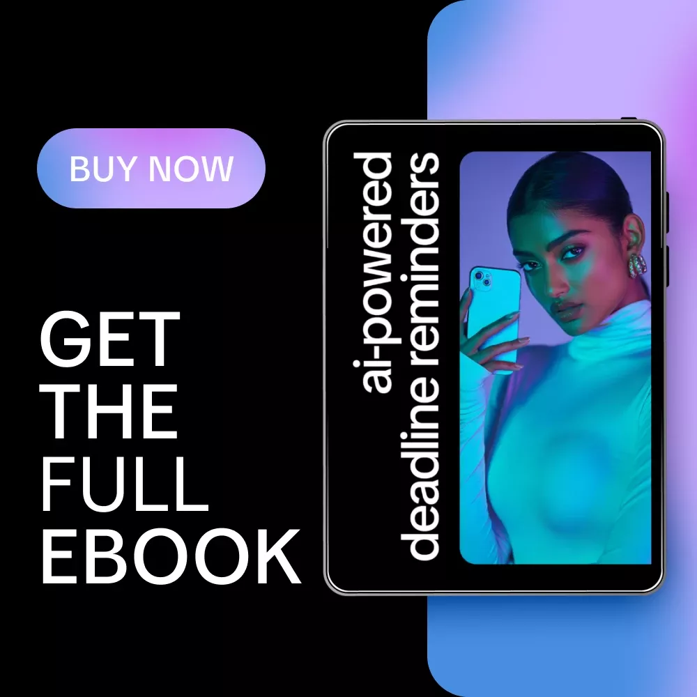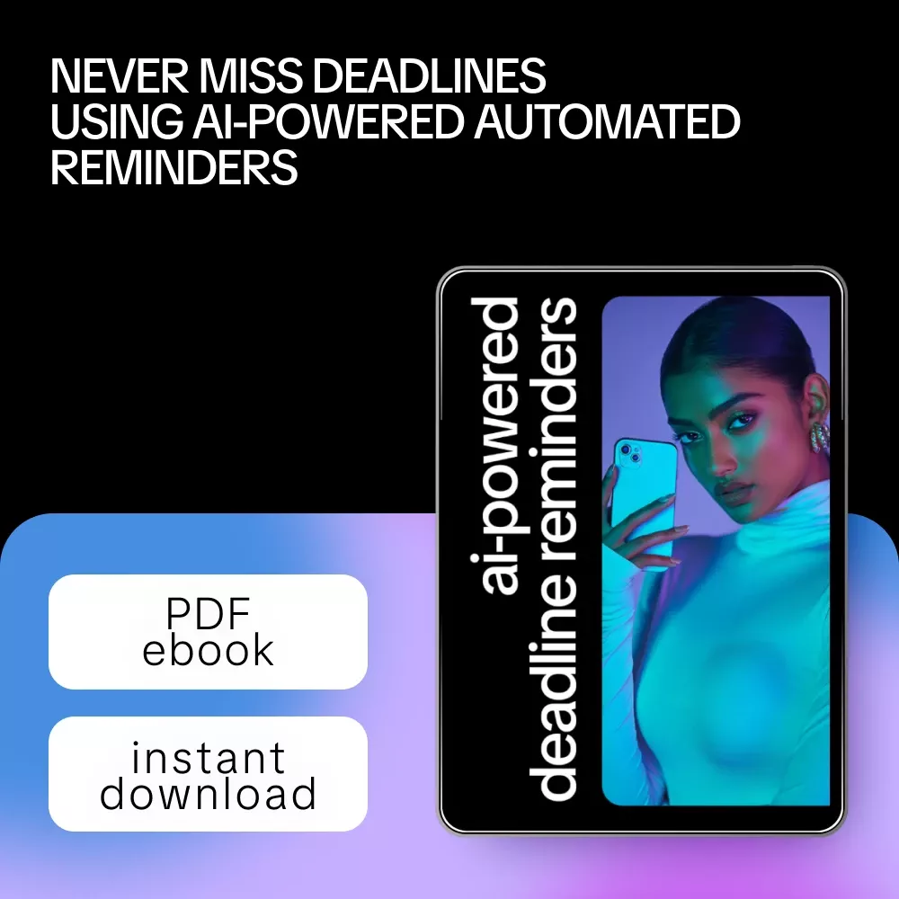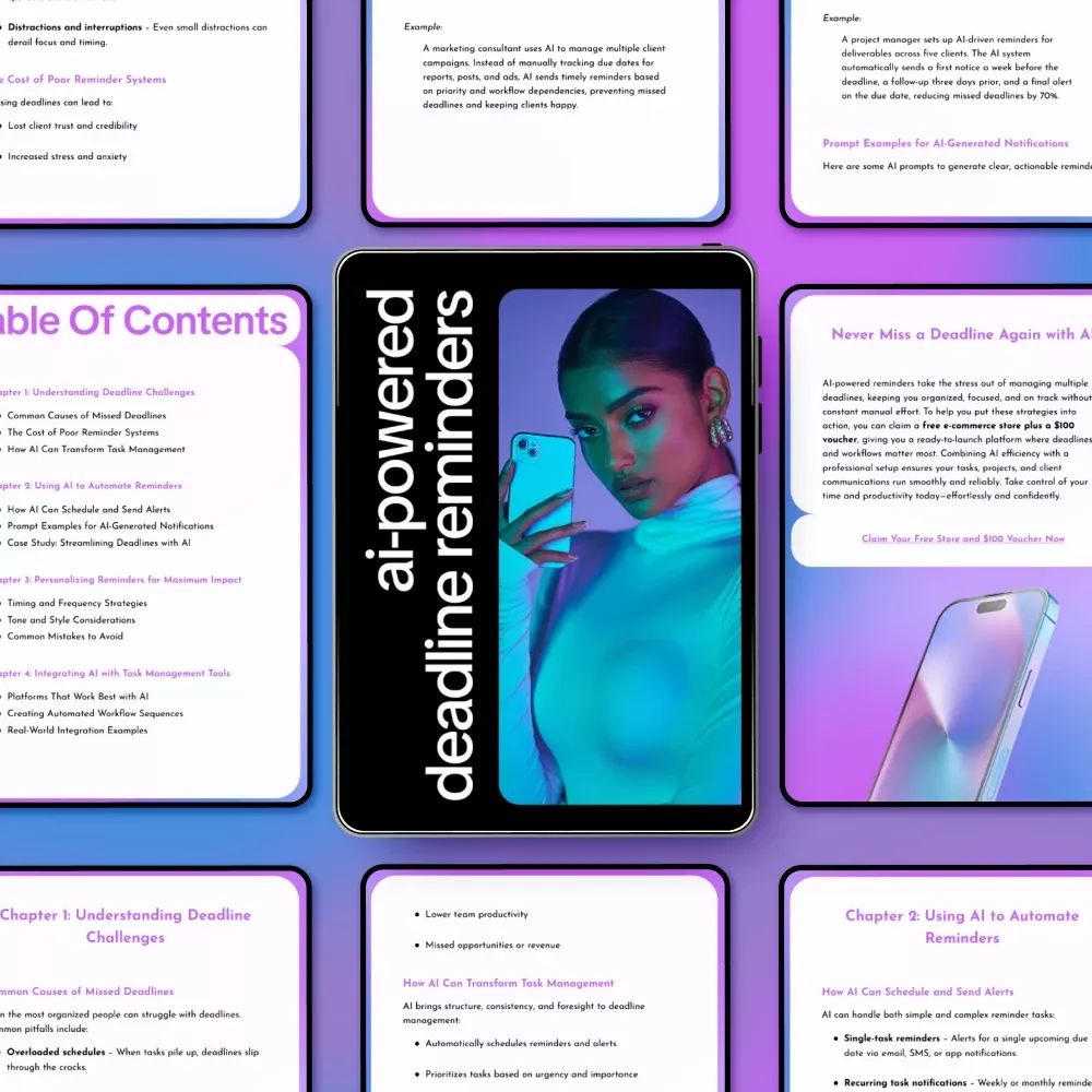 Struggling to keep track of your tasks and deadlines? The AI-Powered Deadline Reminders eBook is your essential digital guide to harnessing the power of AI help for clear deadline reminders. Designed for busy professionals, students, and productivity enthusiasts, this guide will show you how to never miss a deadline again by using smart, AI-driven strategies that are easy to implement and personalize.