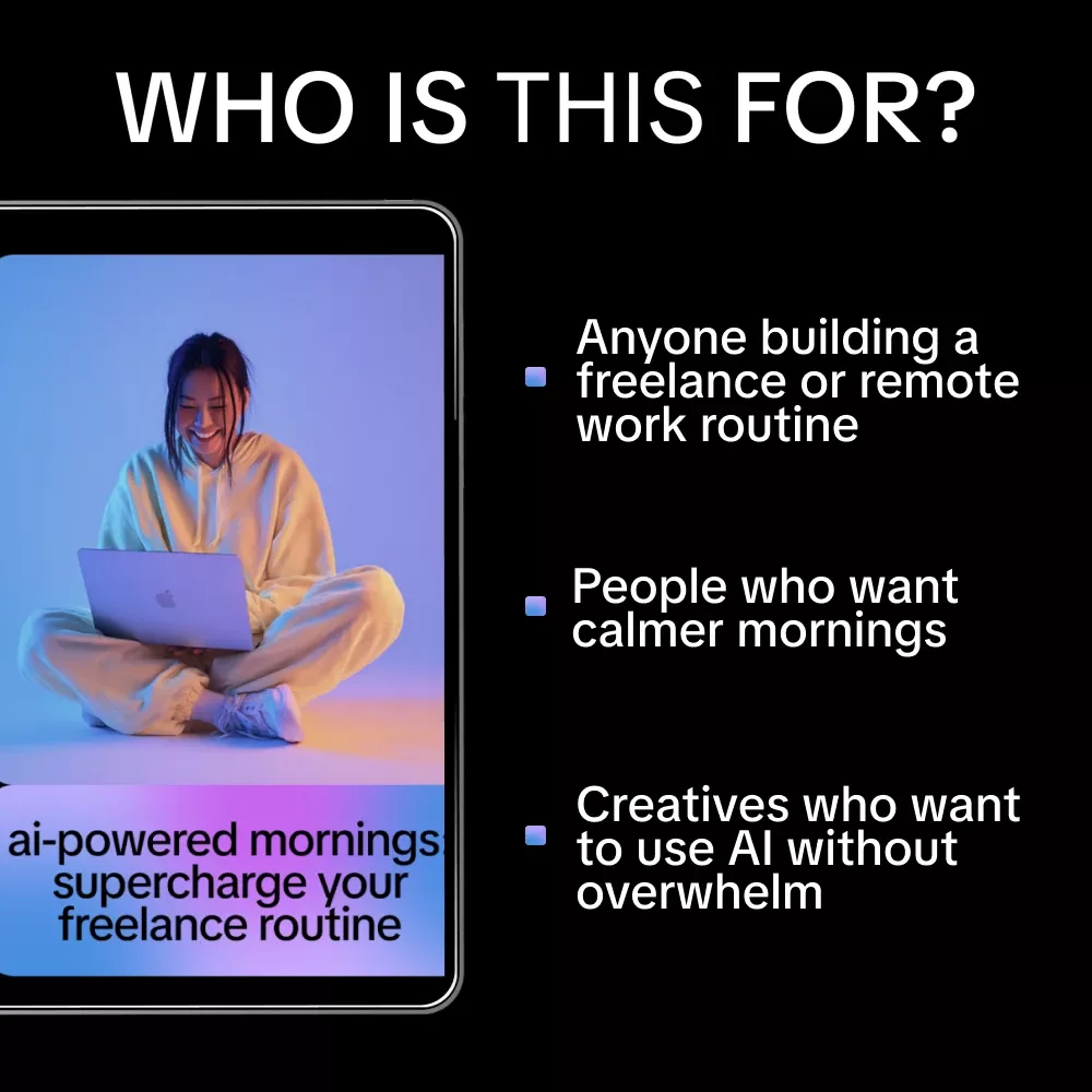 This digital guide is perfect for freelancers, solopreneurs, remote workers, and creatives who want structure without stress. Whether you’re new to AI or already experimenting with tools, this resource shows you exactly how to apply them to your mornings in a simple, sustainable way.