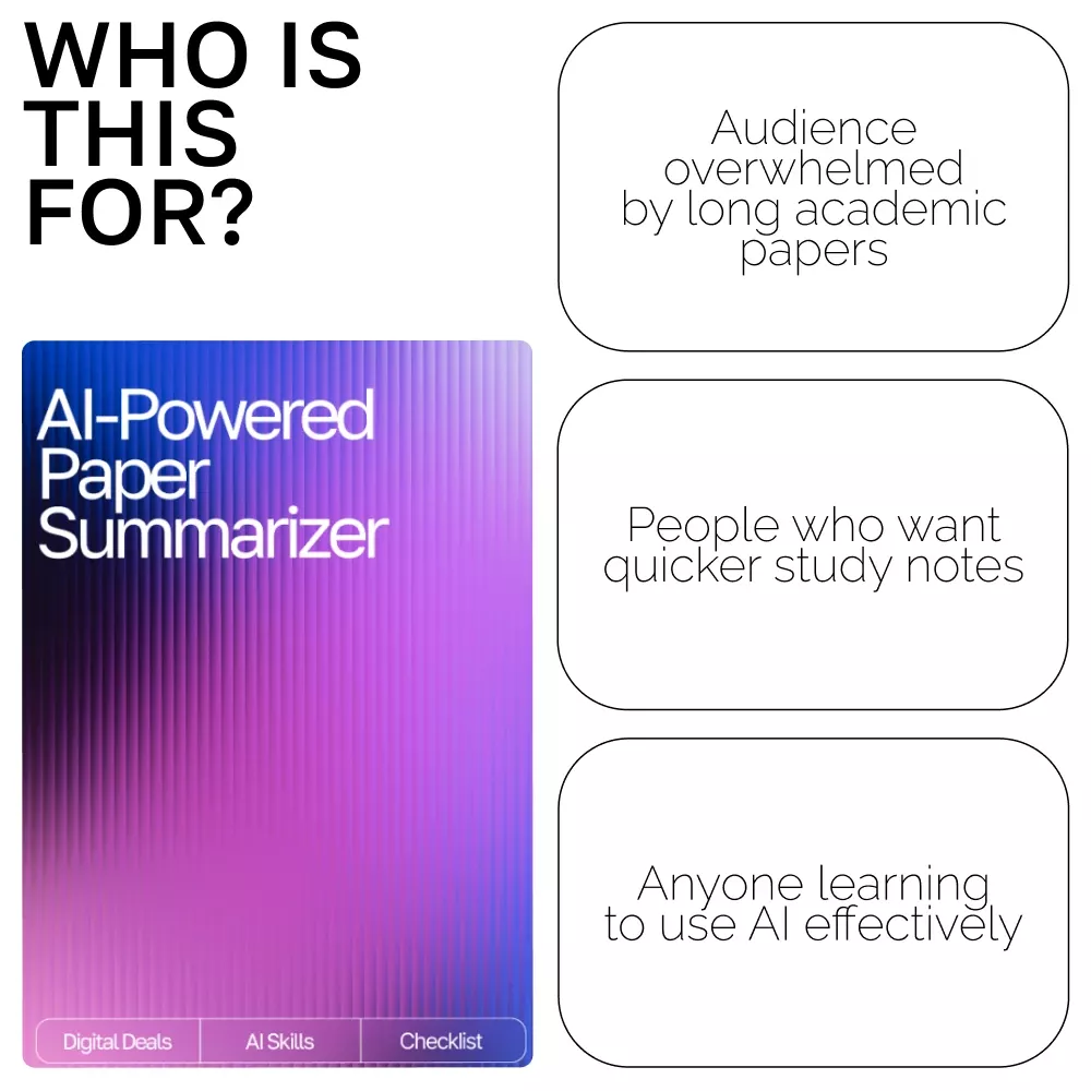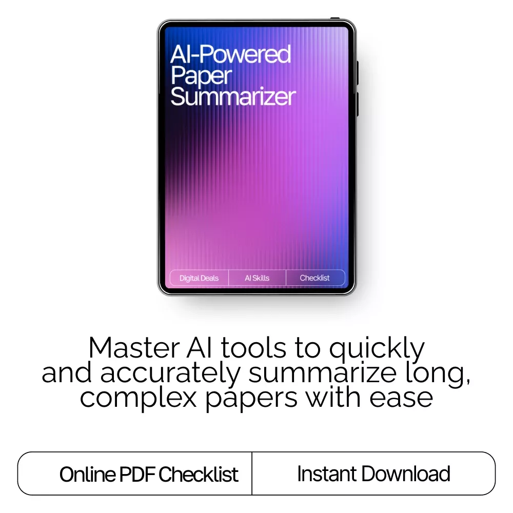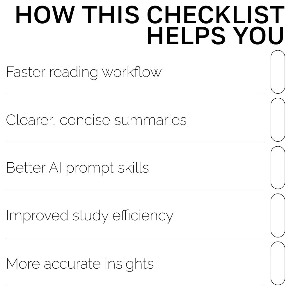 Unlike general AI guides, this checklist is built specifically for summarizing academic papers and complex texts. It gives you highly actionable steps, prompt examples, accuracy checks, and tool-selection guidance—so you’re not guessing what to do next. Everything is organized in a clean, easy-to-follow format that saves time and eliminates overwhelm.
