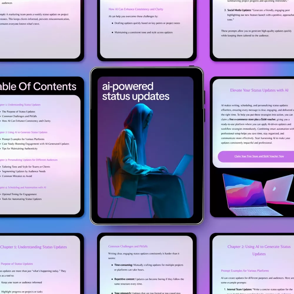 Unlike generic AI writing resources, AI-Powered Status Updates focuses exclusively on real-world status communication. It combines practical prompts, audience-specific strategies, automation tips, and performance tracking—giving you a complete system, not just theory.