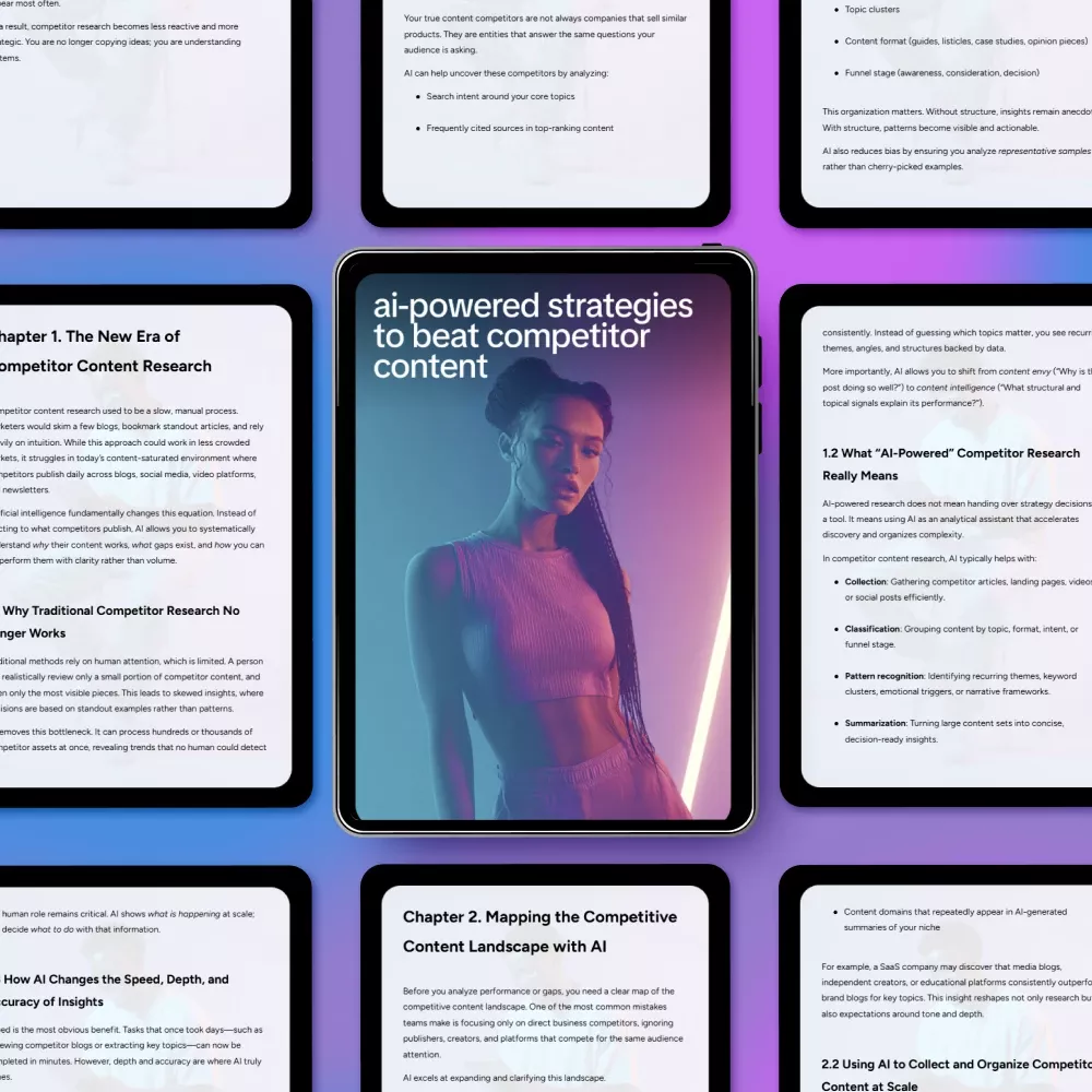AI-Powered Strategies to Beat Competitor Content is a practical, step-by-step ebook designed to show you exactly how modern marketers, creators, and founders are using AI to uncover what competitors are publishing, why it works, and how to do it better. Instead of guessing or copying, this guide teaches you how to use ai for competitor content research in a smart, ethical, and scalable way. You’ll learn how to analyze massive amounts of content faster, spot hidden opportunities, and turn insights into content that actually performs.