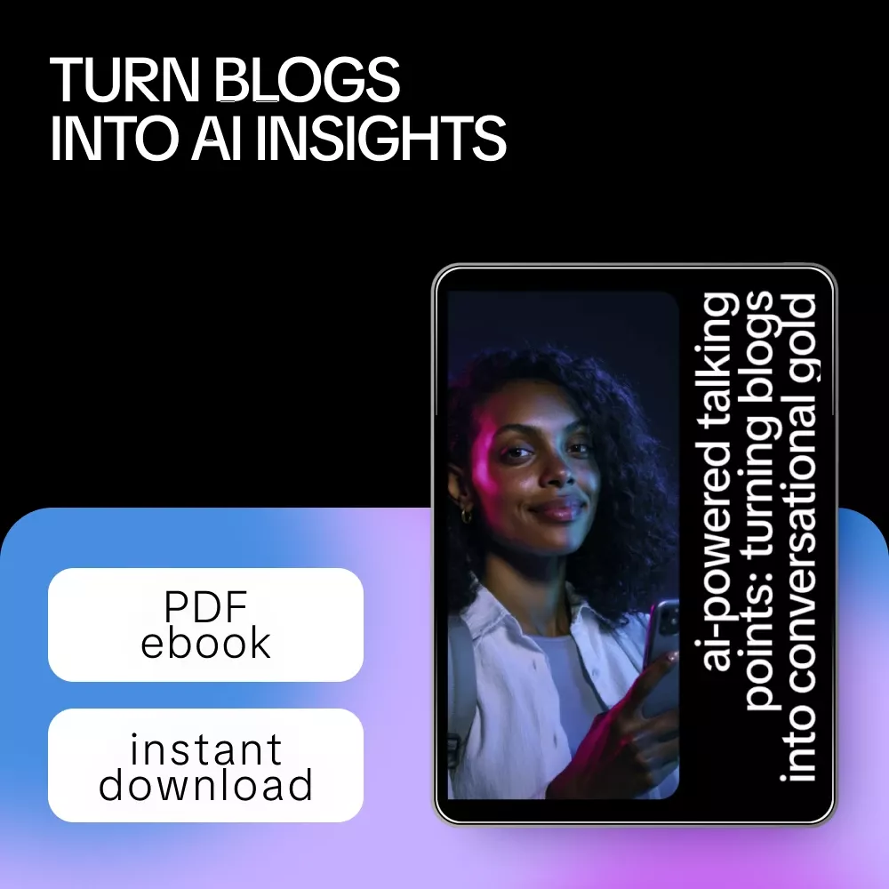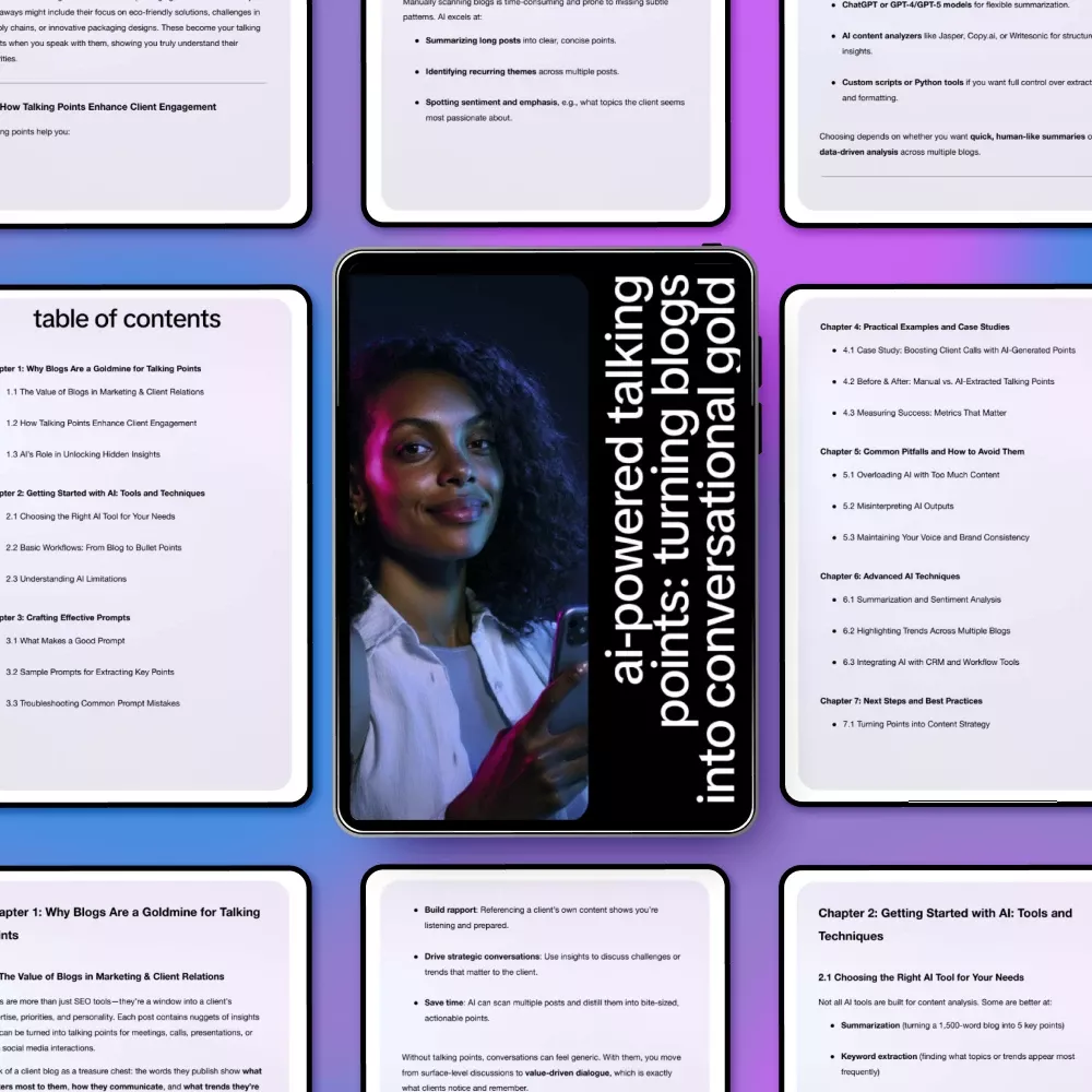 Transform your client interactions and marketing strategy with AI-Powered Talking Points: Turning Blogs into Conversational Gold. This comprehensive eBook is designed to help professionals, marketers, and business owners harness the hidden potential in their blogs. Learn how to use AI to get talking points from a client’s blog, turning ordinary content into engaging conversation starters, valuable insights, and actionable strategies that resonate with your audience.