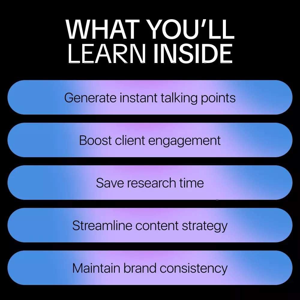 - Practical AI Workflows: Learn how to use AI to get talking points from a client’s blog efficiently.