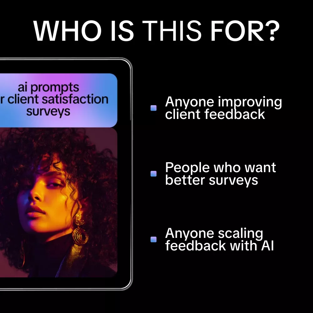 This ebook is ideal for business owners, consultants, agencies, SaaS teams, customer success managers, and freelancers who rely on client feedback to grow. If you want faster insights without hiring analysts or wasting time rewriting surveys, this resource is built for you.