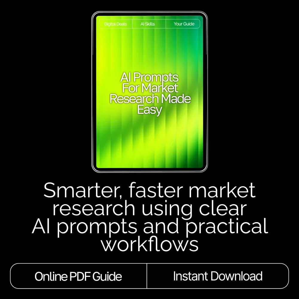 Unlike generic AI prompt lists, this guide teaches you why prompts work, how to customize them for your niche, and what to do with the insights you uncover. It blends real examples, practical breakdowns, and a clear step-by-step approach so you can confidently use ai prompts for market research in real-world situations.
