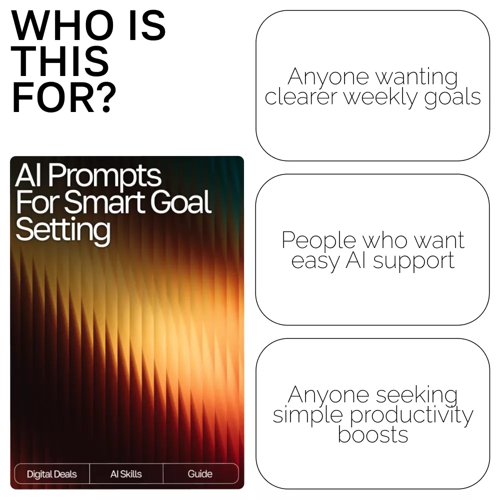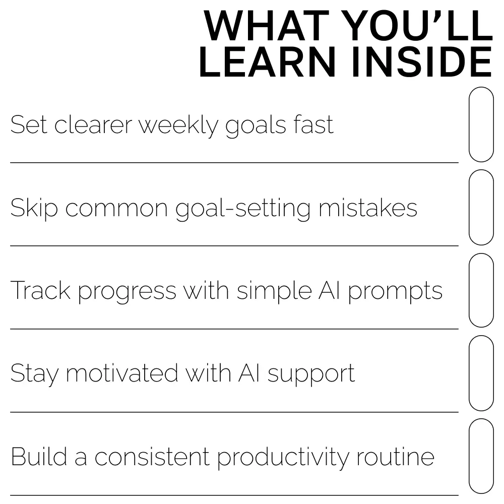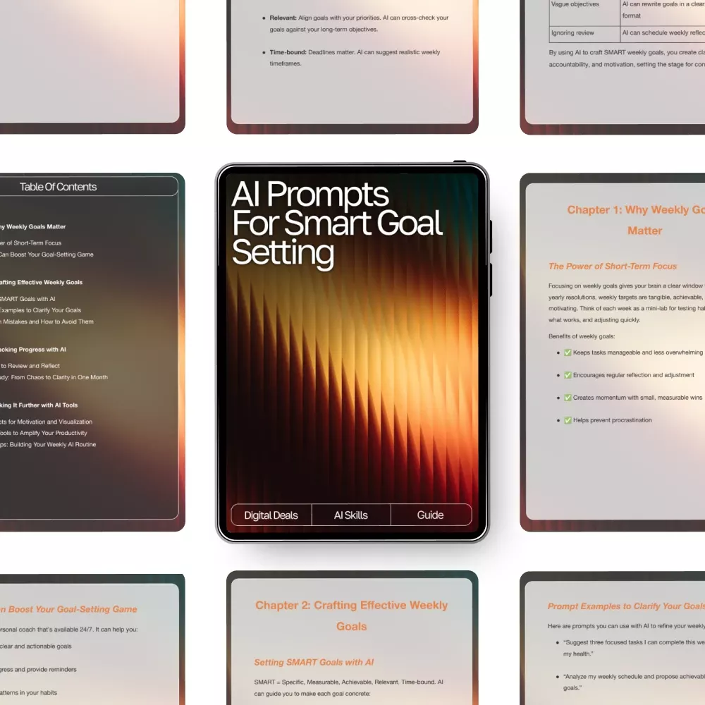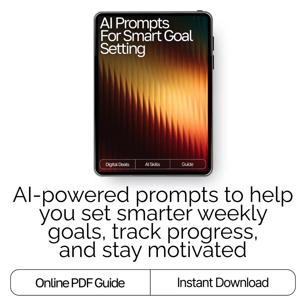 Transform your weekly planning with the help of AI. Download AI Prompts for Smart Goal Setting now and start creating the focused, productive, and balanced life you’ve been working toward. Your most intentional week begins here.