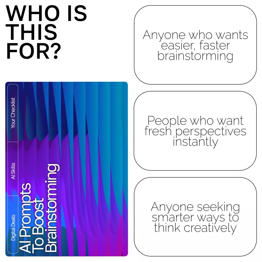 This digital guide is perfect for entrepreneurs, creators, writers, marketers, educators, coaches, and anyone who wants to make AI-driven brainstorming faster, smarter, and more imaginative. If you rely on fresh ideas to fuel your work, this resource will elevate every session.