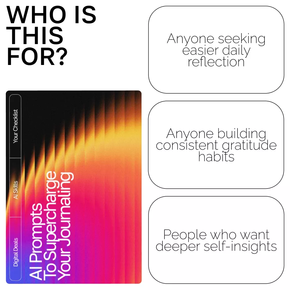 This digital checklist is ideal for journalers, self-care enthusiasts, mindfulness seekers, and anyone wanting to enrich their daily gratitude practice with ai prompts for gratitude journaling. It’s also a great fit for busy individuals who want quick, structured guidance they can use anytime.