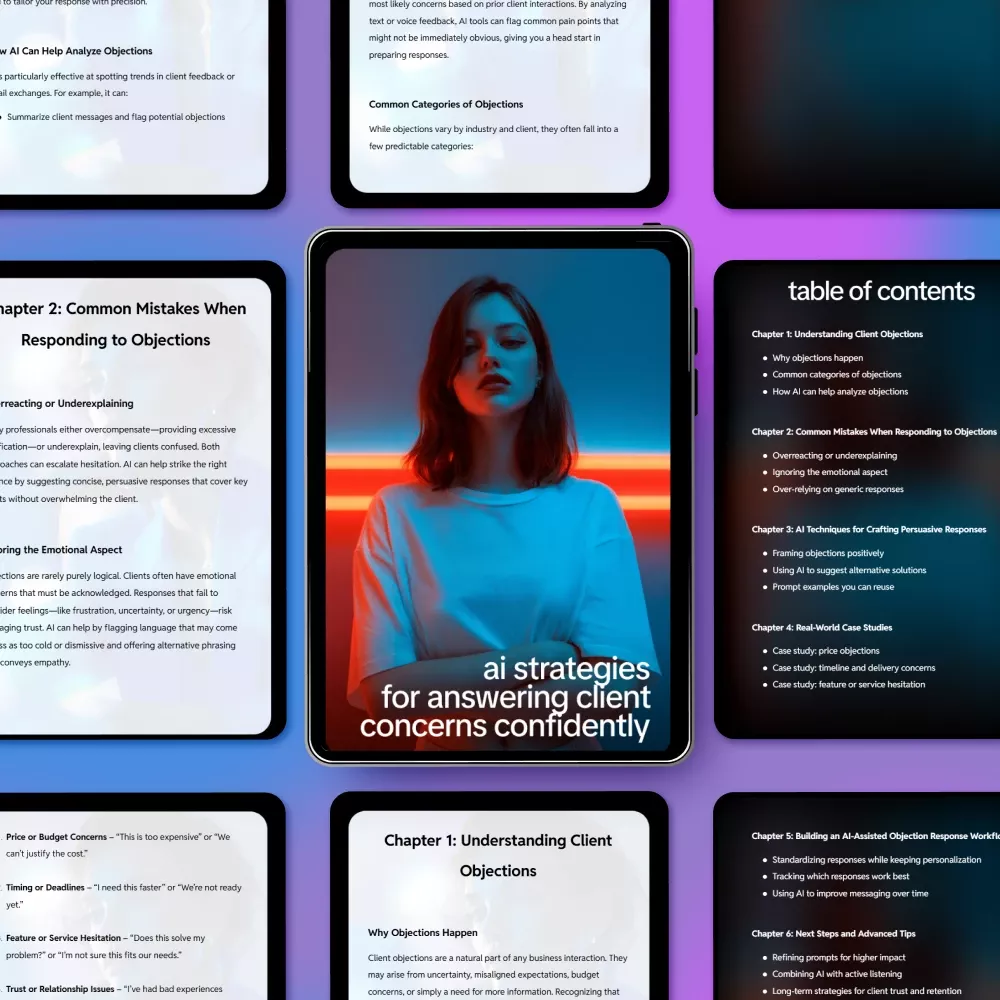 Struggling to respond to client objections effectively? AI Strategies for Answering Client Concerns Confidently is a comprehensive digital guide designed to help professionals, sales teams, and customer success specialists transform tricky conversations into opportunities for trust and conversion. This practical eBook and checklist combine real-world insights with AI-driven techniques, so you can confidently address concerns, handle objections smoothly, and create persuasive responses that resonate with your clients.