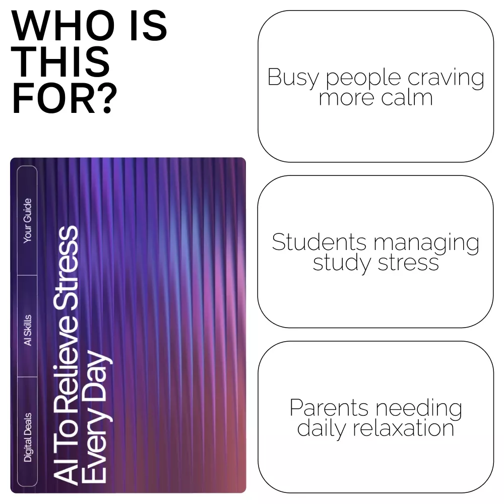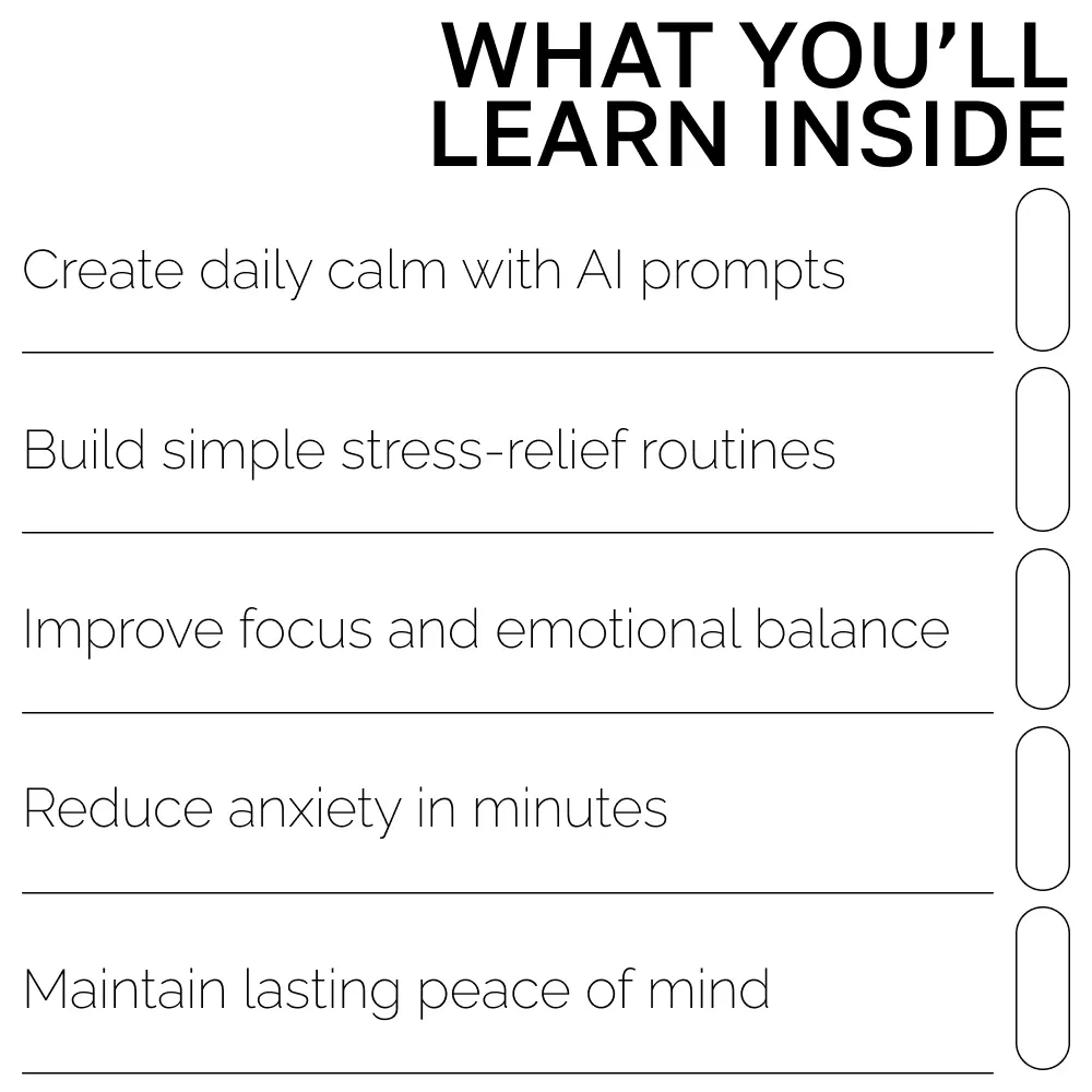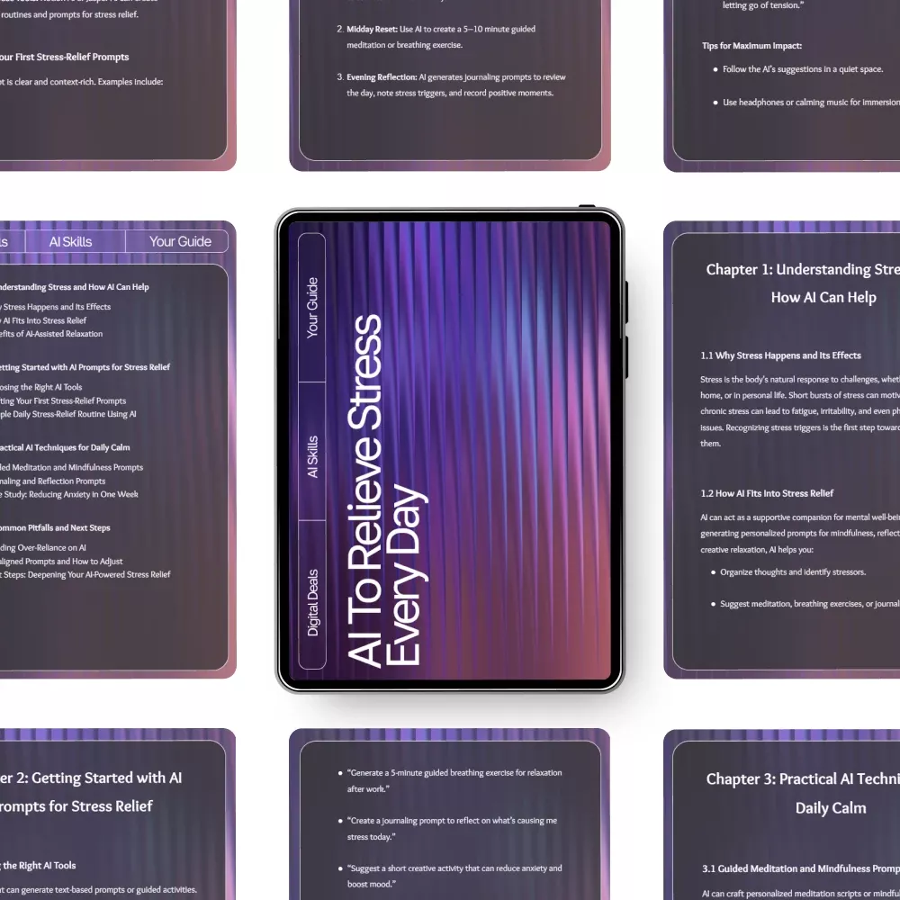Unlike typical self-help guides, AI to Relieve Stress Every Day merges mindfulness and technology. You’ll learn how to use ai prompts for stress relief to design daily routines that feel personal, effective, and easy to maintain. It’s not about forcing calm—it’s about creating it naturally through consistent, guided practice.