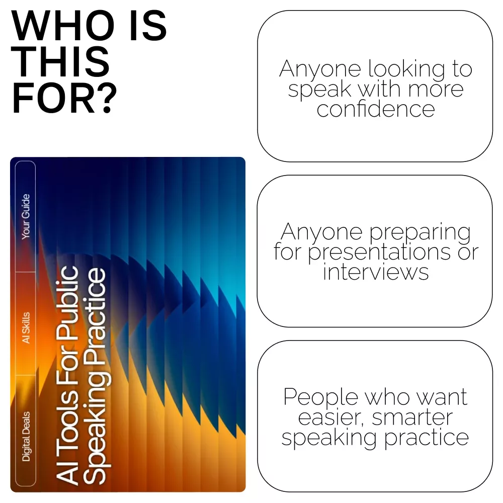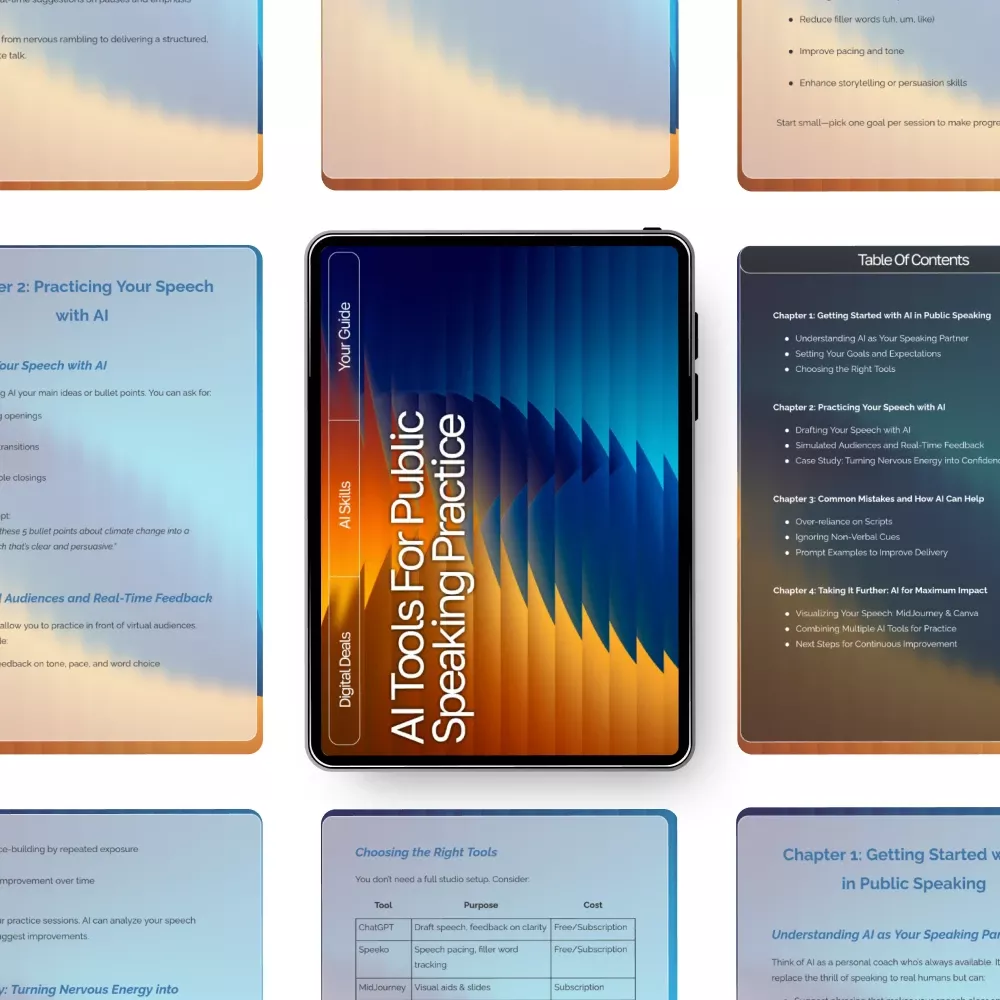 If you’ve ever wished for a personal speaking coach who’s available anytime, this digital guide is your new secret weapon. AI Tools for Public Speaking Practice is a powerful, easy-to-follow resource designed to help you overcome speaking anxiety, improve your delivery, and elevate your confidence using the smartest tools available today. Whether you’re preparing for a presentation, interview, keynote, or classroom activity, this guide walks you step-by-step through how to use AI to build compelling speeches and practice them effectively—right from home.