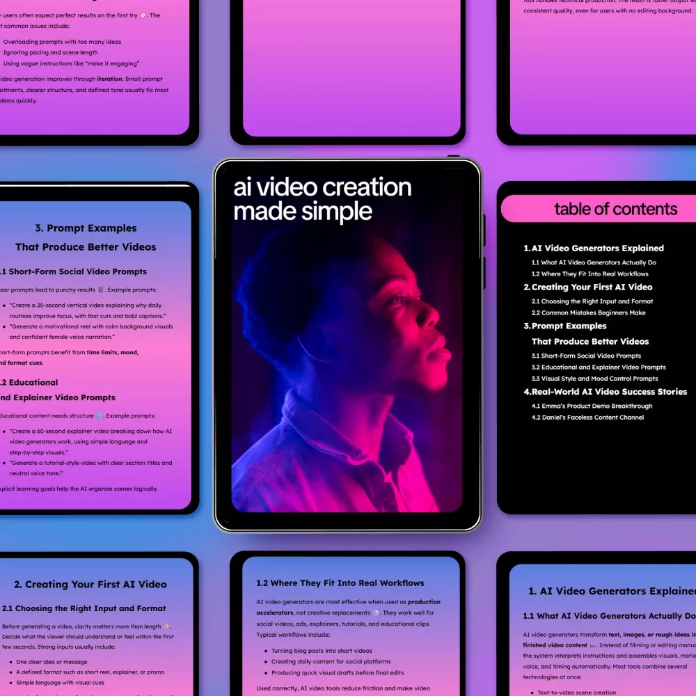 Unlike generic AI guides, AI Video Creation Made Simple focuses on real prompts, real workflows, and real success stories. It shows you exactly how people are using AI video tools today, not just what the tools can do in theory.