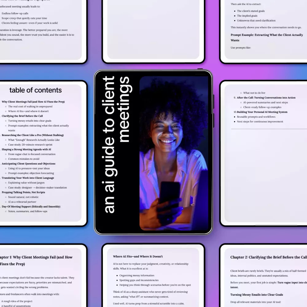 Unlike generic meeting guides, An AI Guide to Client Meetings specifically shows you how to use AI to prepare for client meetings. It combines actionable prompts, case studies, and practical workflows—so you can apply AI immediately without becoming robotic or losing your personal touch. This isn’t theory—it’s a hands-on toolkit for modern professionals.