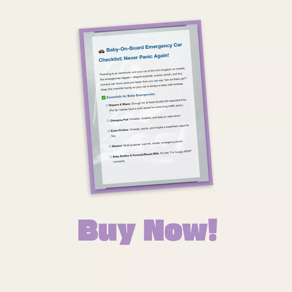 Parenthood doesn’t pause for traffic jams, blowouts, or roadside surprises. The Baby-On-Board Emergency Car Checklist: Never Panic Again! is your go-to digital download for peace of mind whenever you hit the road with your little one. This printable checklist is designed by parents for parents who want to be ready for anything—from diaper disasters to snack meltdowns—without ever asking, “What did I forget?” Whether it’s a quick errand or a long road trip, this guide makes sure your car is stocked, safe, and baby-approved.