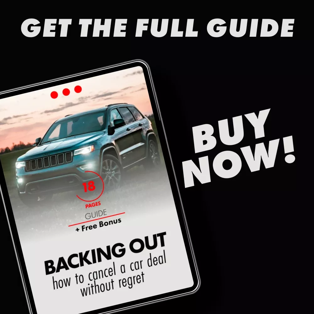 If you’re ready to cancel a car deal and move on, download your copy of Backing Out: How to Cancel a Car Deal Without Regret now! Don’t let uncertainty hold you back. With this guide, you’ll have everything you need to take control and make informed decisions that are in your best interest. Download now and take the first step towards a hassle-free car buying experience!