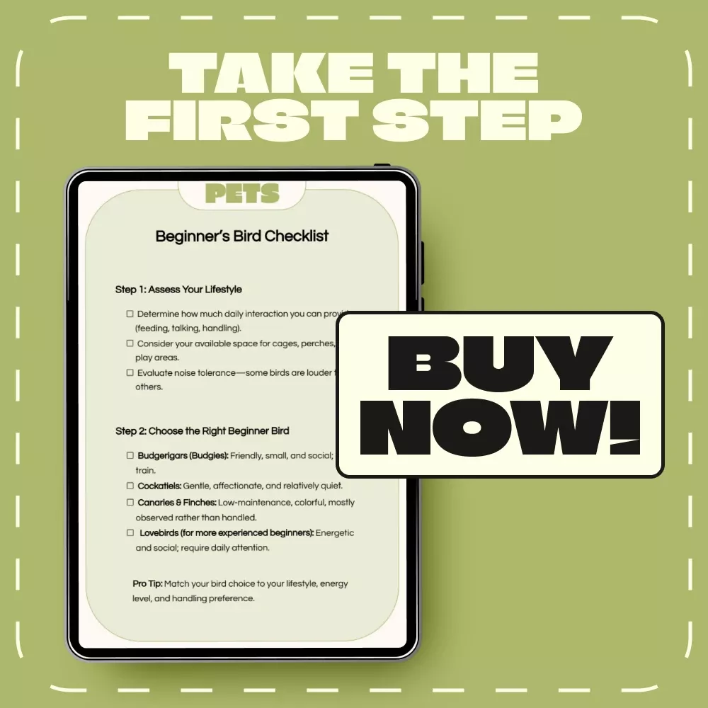 Dreaming of bringing a feathered friend into your life? The Beginner’s Bird Checklist is your go-to digital guide for finding and caring for the best pet birds for beginners. Designed for first-time bird owners, this printable and easy-to-follow checklist walks you through every essential step—from choosing the right species to creating a loving, stimulating home. Whether you’re drawn to the gentle chirps of a canary or the friendly chatter of a budgie, this guide helps you make confident, informed choices while building a happy bond with your new companion.