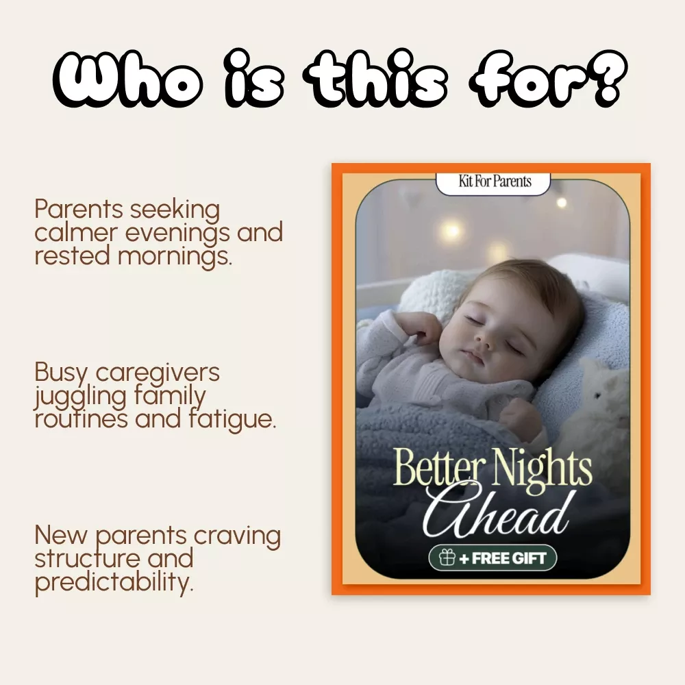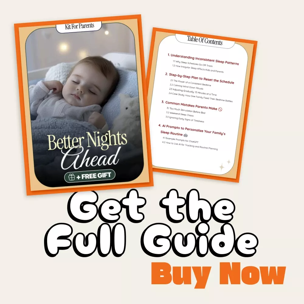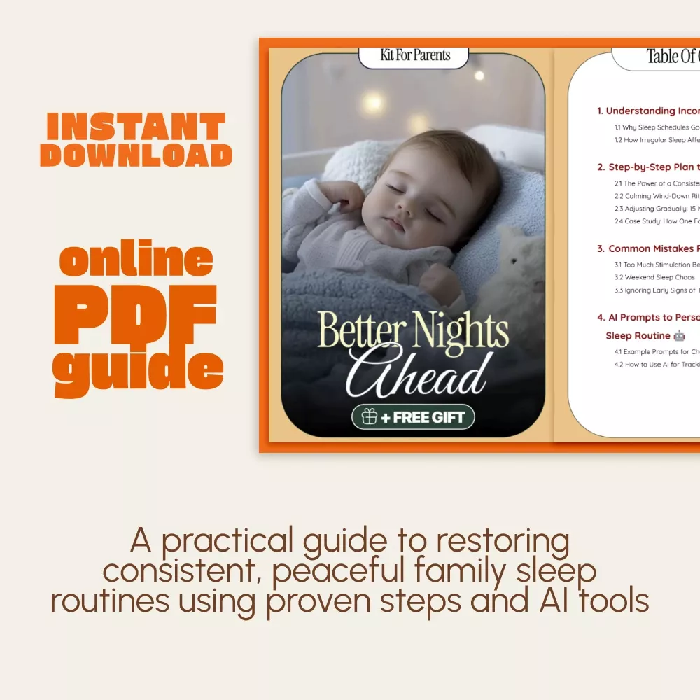 Say goodbye to bedtime battles and sleepless nights. Better Nights Ahead is a digital guide designed to help families understand, reset, and maintain a healthy sleep rhythm. Whether your little one is struggling to fall asleep, or your entire household has fallen into unpredictable nights, this resource gives you a gentle, science-backed plan to get everyone back on track. Learn how to fix inconsistent sleep schedule at night with easy steps, real-life examples, and smart tools that make the process simple and sustainable.