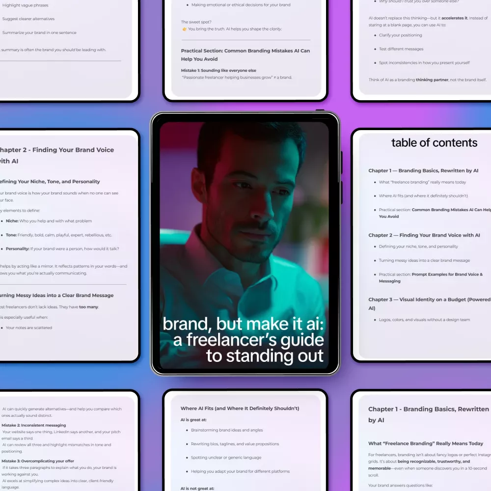 Brand, But Make It AI: A Freelancer’s Guide to Standing Out is a digital download you can start using immediately. If you’re ready to build a confident, consistent freelance brand with the help of AI, this guide is your next step. Download now and start standing out with clarity.