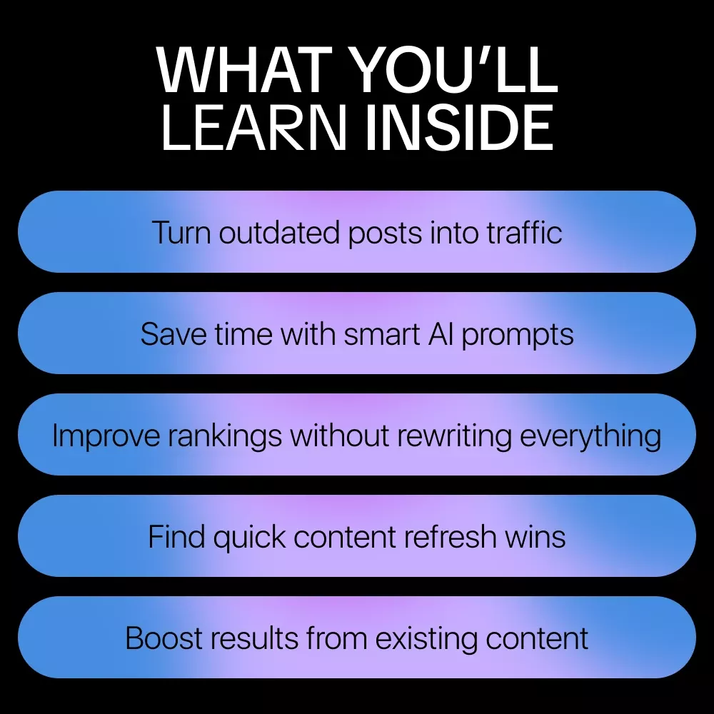 This isn’t theory or fluff. It’s a step-by-step system designed for real-world content creators. You’ll learn exactly how to decide what to update, how to improve clarity and rankings, and how to use AI as a helpful assistant — not a shortcut that hurts quality.