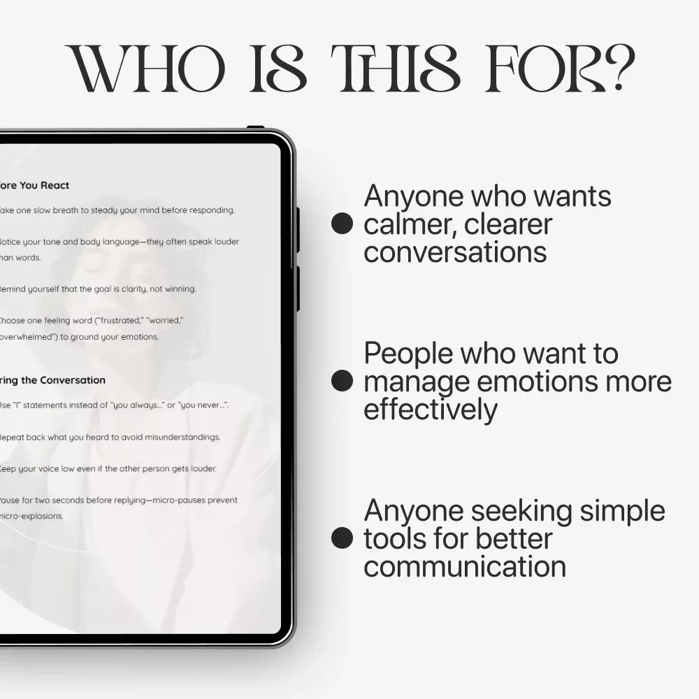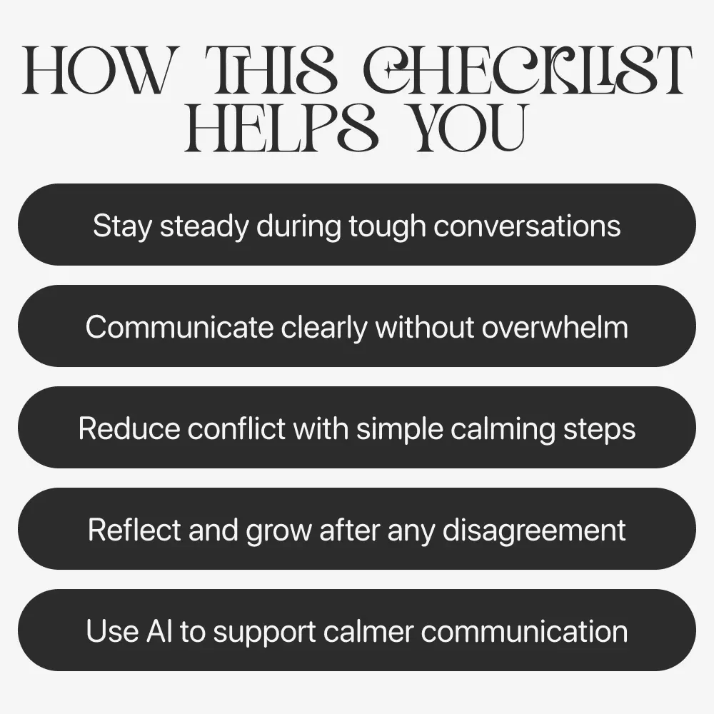Most communication or self-help resources focus on theory. The Calm in the Moment Checklist gives you immediate, practical steps you can use exactly when emotions run high. It also blends modern tools—like AI-assisted rephrasing and empathy role-play—to give you a fresh, supportive way to approach tough conversations with confidence and compassion.