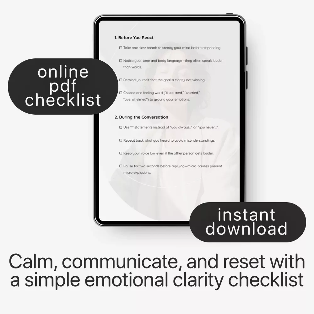 The Calm in the Moment Checklist is a simple, powerful digital guide designed to help you stay grounded, communicate clearly, and break reactive habits during emotionally charged moments. Whether you’re navigating relationship tension, workplace stress, or overwhelm in daily life, this printable and screen-friendly checklist gives you step-by-step support you can use instantly. Created for anyone seeking emotional regulation, mindful communication, and more peaceful interactions, this guide brings clarity when you need it most.
