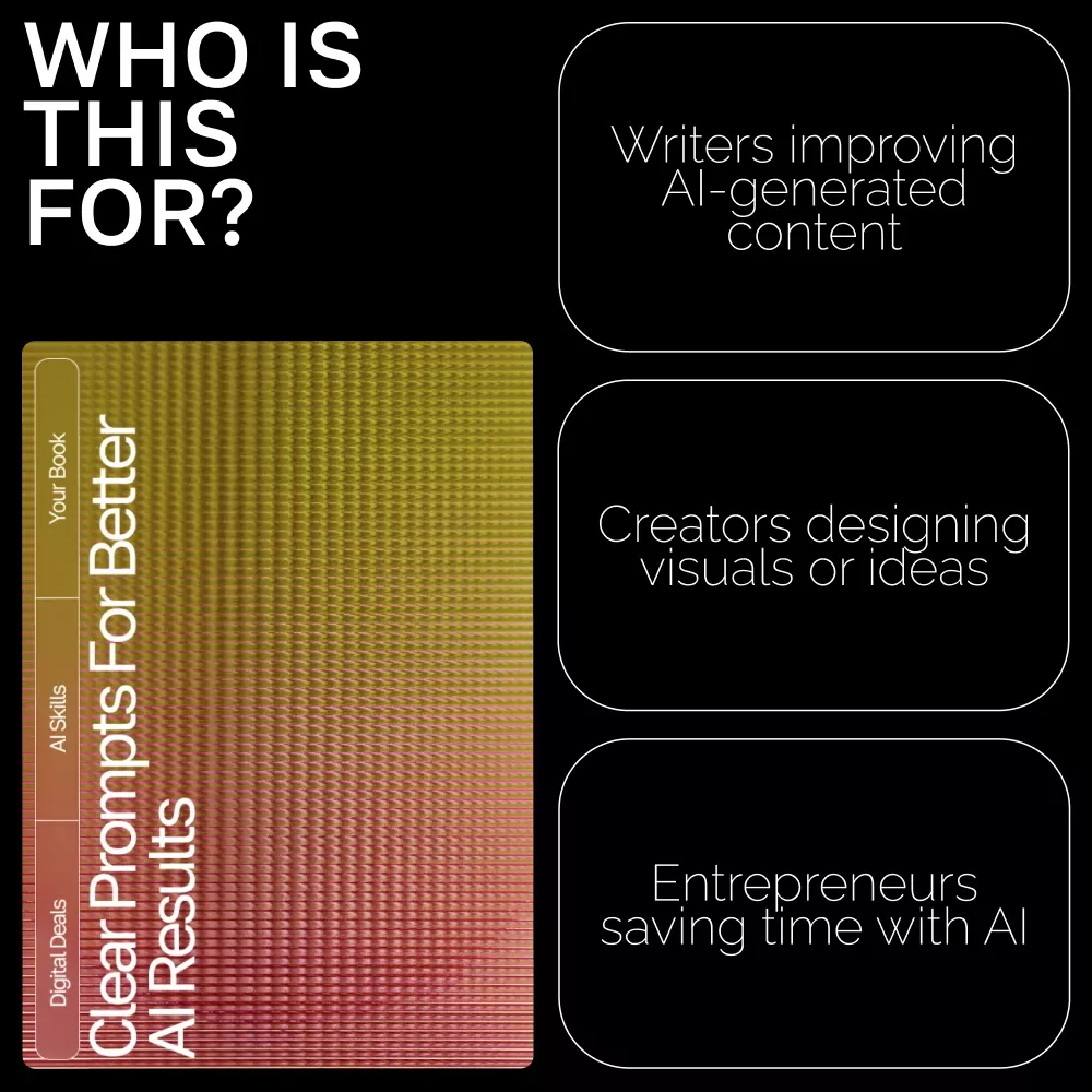This eBook is designed for creators, writers, entrepreneurs, students, and anyone curious about getting more value from AI tools. Whether you use ChatGPT, MidJourney, or other platforms, Clear Prompts for Better AI Results helps you communicate smarter and generate outputs that truly match your goals.