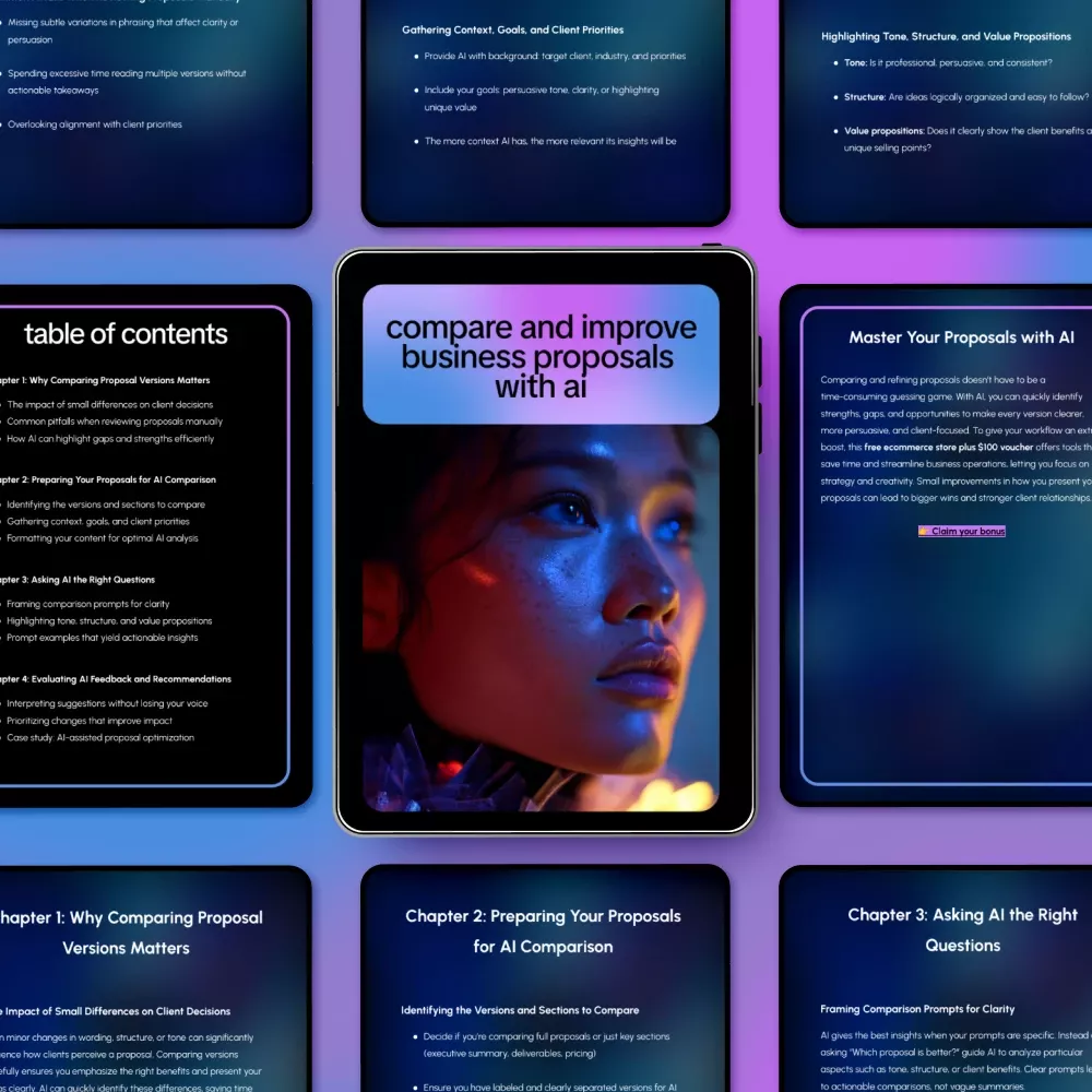 Unlock the power of artificial intelligence to elevate your business proposals with our comprehensive eBook, Compare and Improve Business Proposals with AI. This step-by-step digital guide is designed for professionals, freelancers, and teams who want to maximize their proposal impact while saving time. Learn exactly how to ask AI to compare proposal versions and gain actionable insights that make your proposals sharper, more persuasive, and aligned with client priorities.