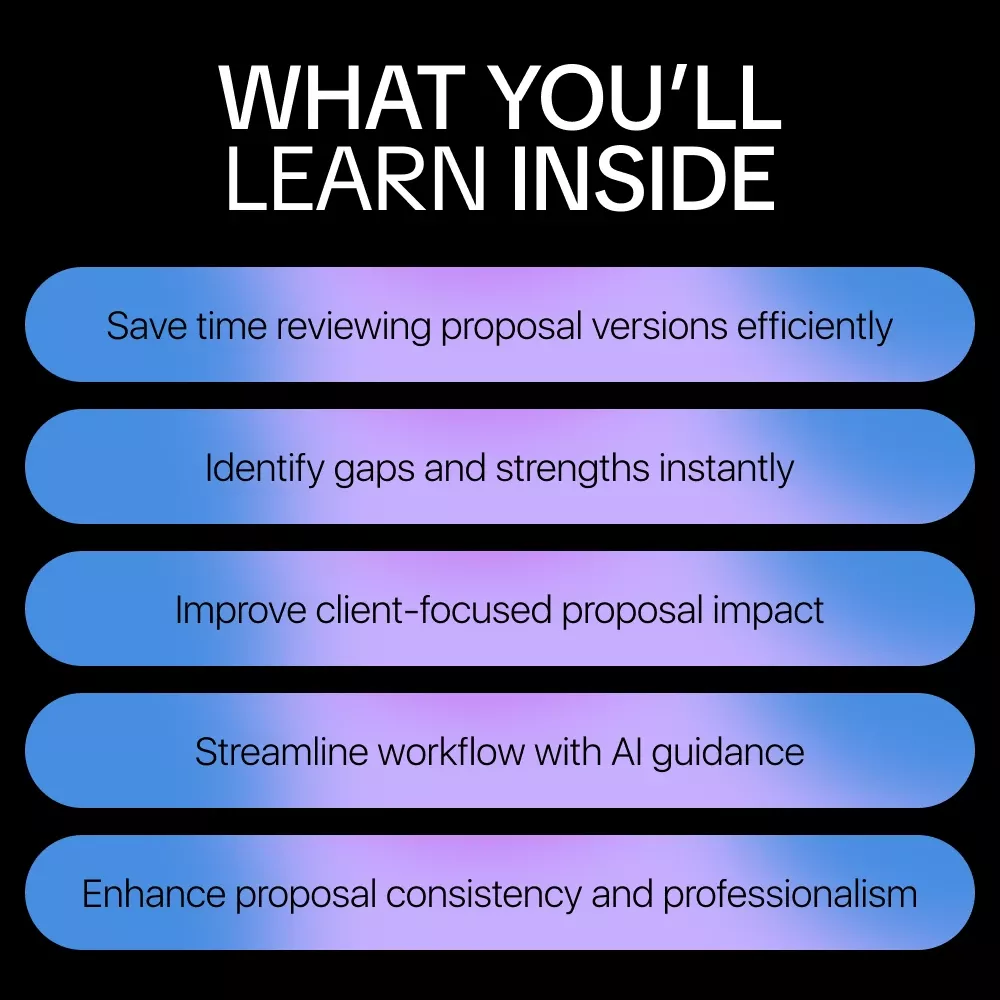 - Chapter 1: Understand why comparing proposal versions matters and how AI highlights gaps and strengths efficiently.