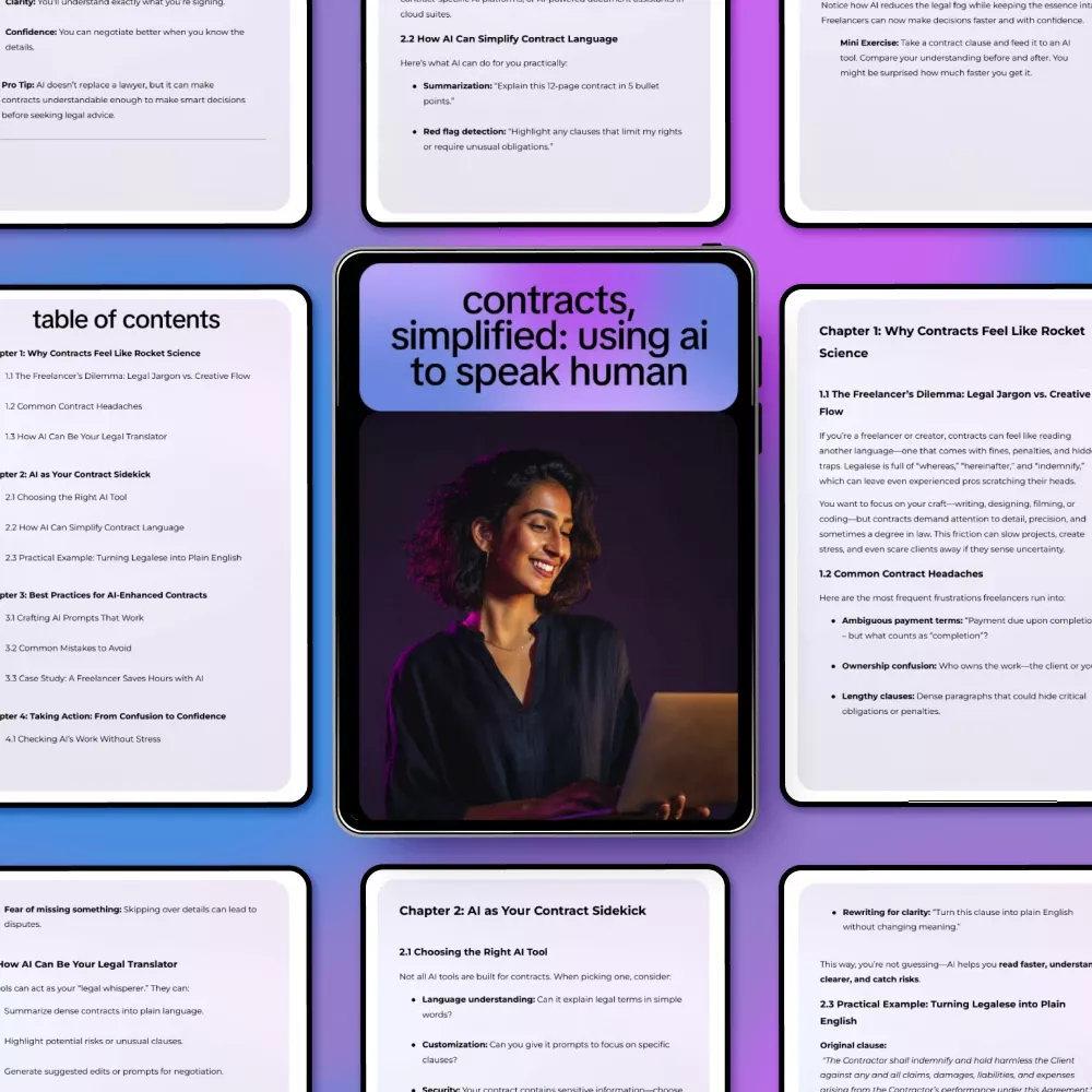 Contracts don’t have to feel intimidating, overwhelming, or impossible to understand. Contracts, Simplified: Using AI to Speak Human is a practical, easy-to-follow digital guide designed to help you finally understand contract language without drowning in legal jargon. If you’ve ever felt stuck between protecting yourself legally and staying focused on your creative or freelance work, this guide bridges that gap. You’ll learn how to use ai to simplify contract language so contracts feel clear, approachable, and human again.