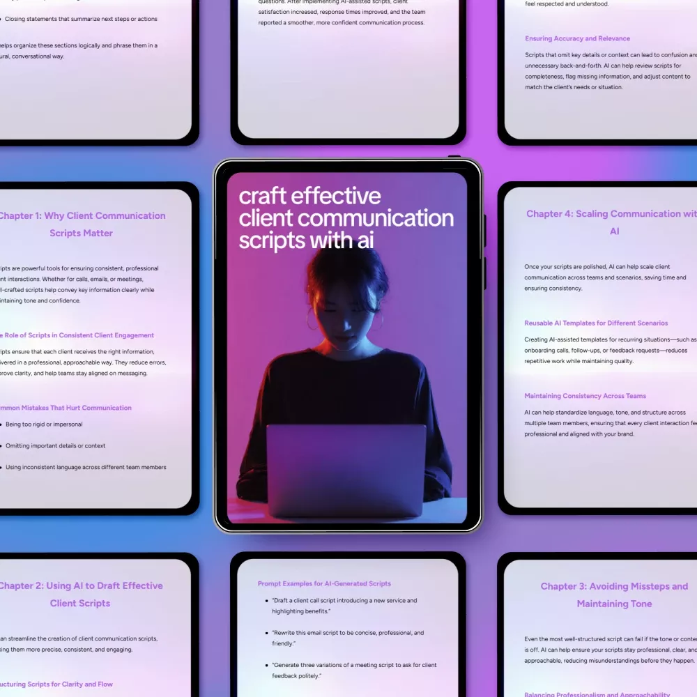 If you’re ready to streamline your workflow, improve client relationships, and finally feel confident using AI in your business, Craft Effective Client Communication Scripts with AI is your next essential resource. Download the guide today and start creating client communication scripts that sound human, professional, and effective.
