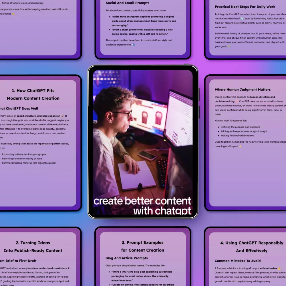 Unlike generic AI tutorials, Create Better Content With ChatGPT focuses on practical, real-world strategies that creators can apply immediately. It combines theory, actionable examples, and case studies to provide a complete learning experience that goes beyond surface-level tips.