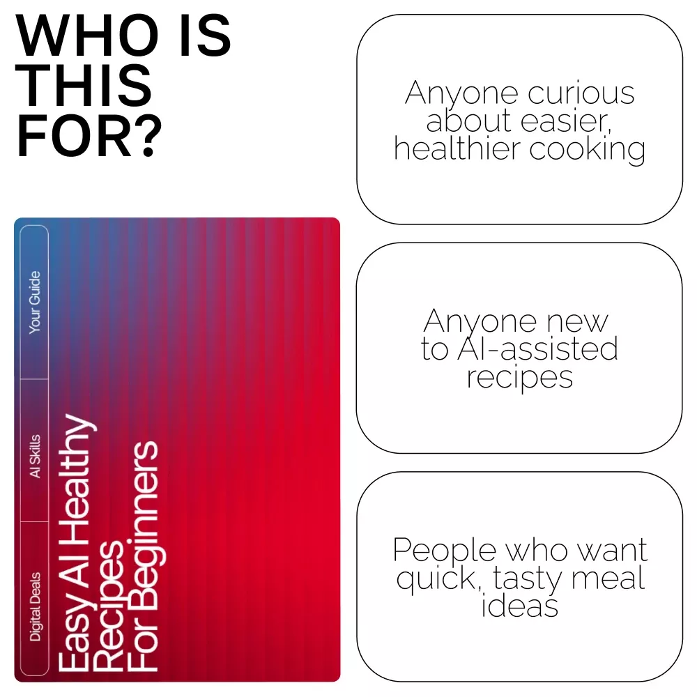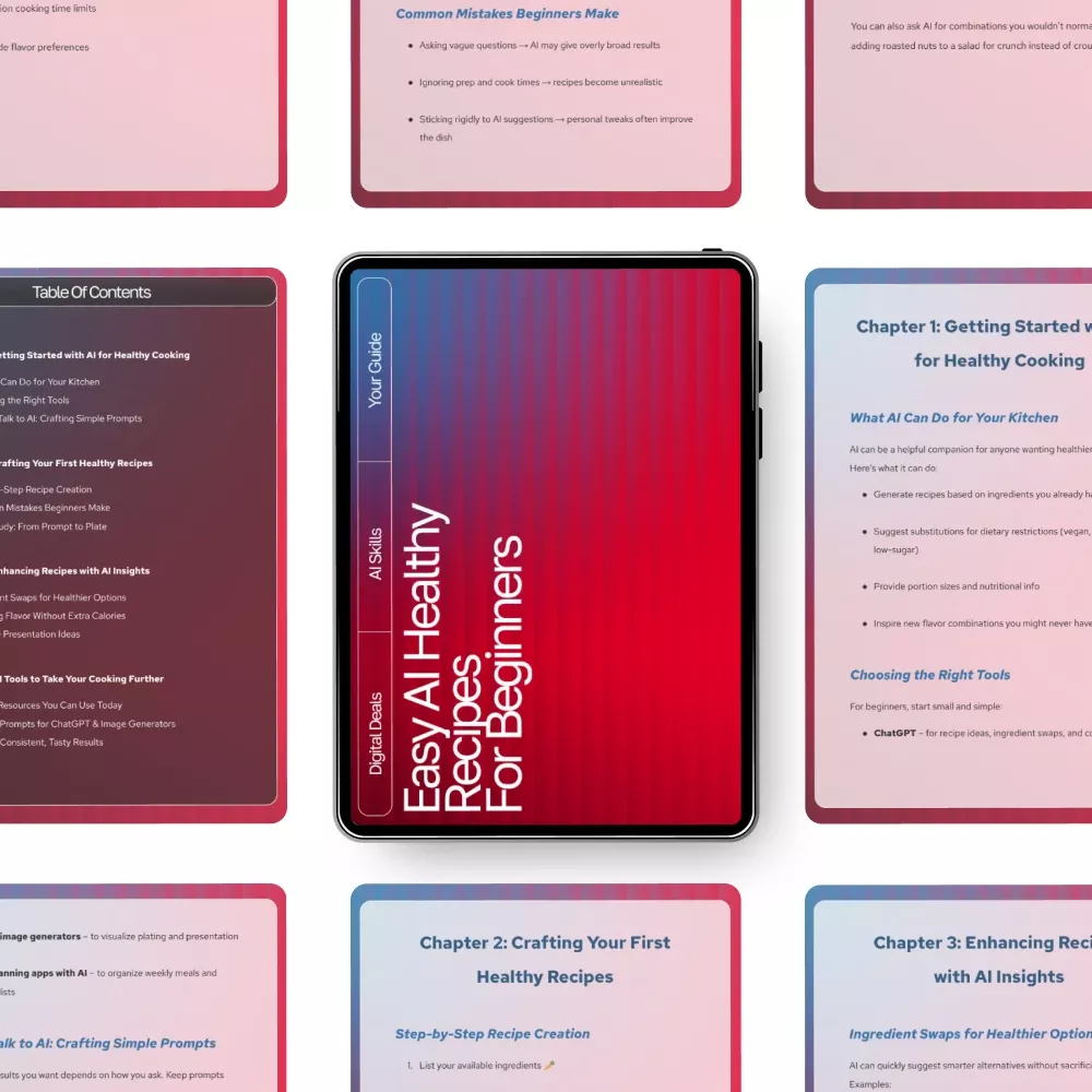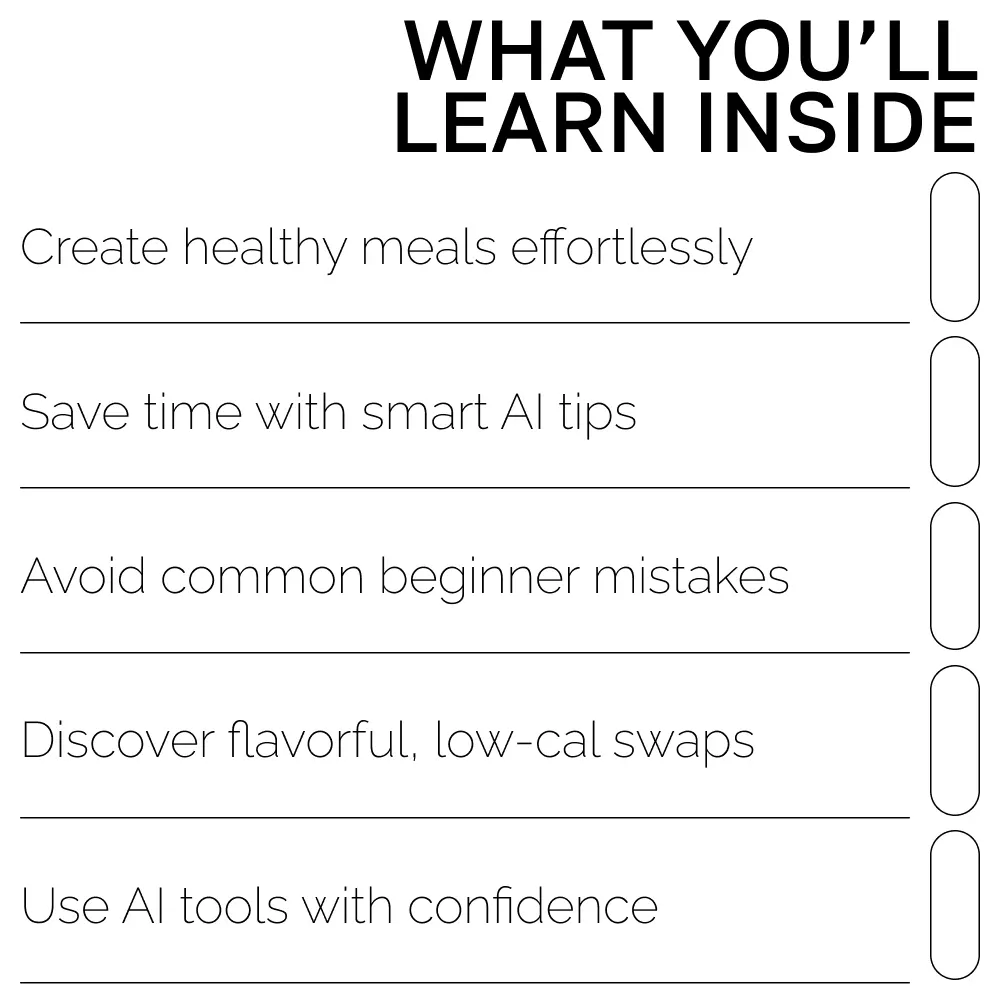 Unlike other recipe eBooks, this guide doesn’t just hand you a list of meals—it teaches you how to use AI tools creatively and confidently so you can generate endless healthy recipe ai suggestions for beginners on your own. You’ll learn practical methods, real tools, and proven prompt strategies tailored to everyday cooking. The result? More freedom, more flavor, and more fun in the kitchen.