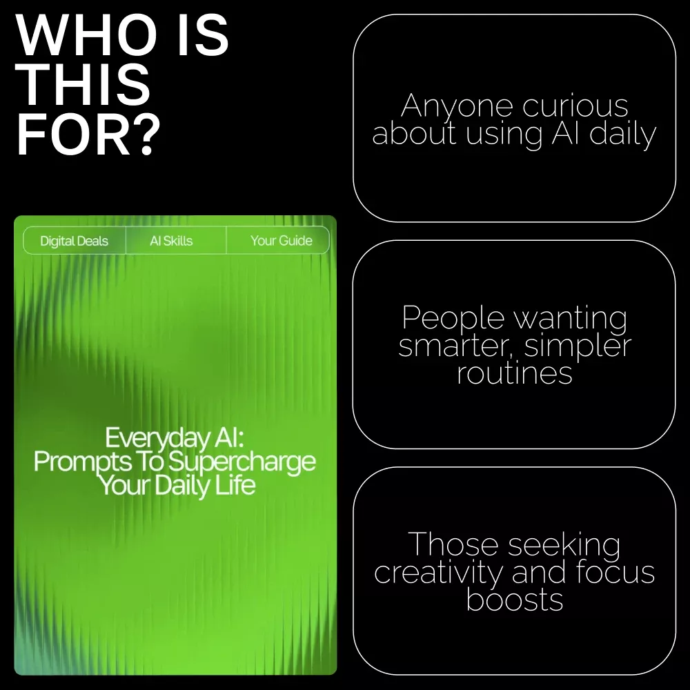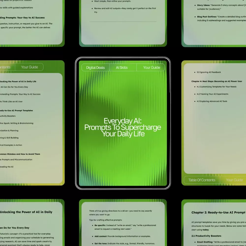 Download Everyday AI: Prompts to Supercharge Your Daily Life now and start turning your ordinary routines into extraordinary results. Master the art of ai prompt templates for daily use and see how effortless, productive, and inspired your life can be — all from one simple digital guide.